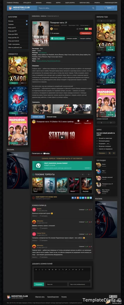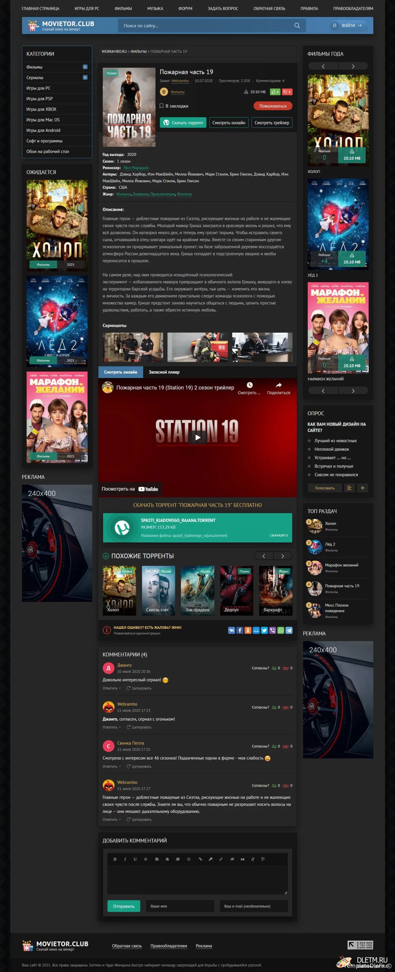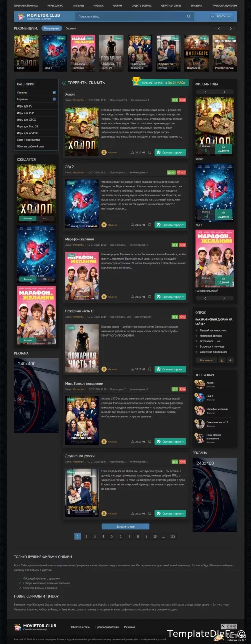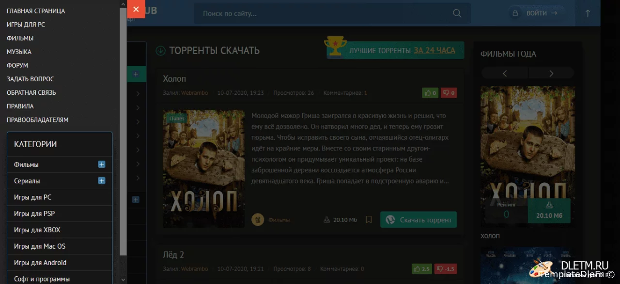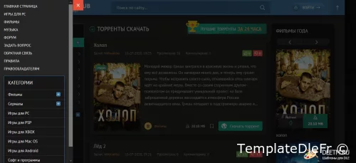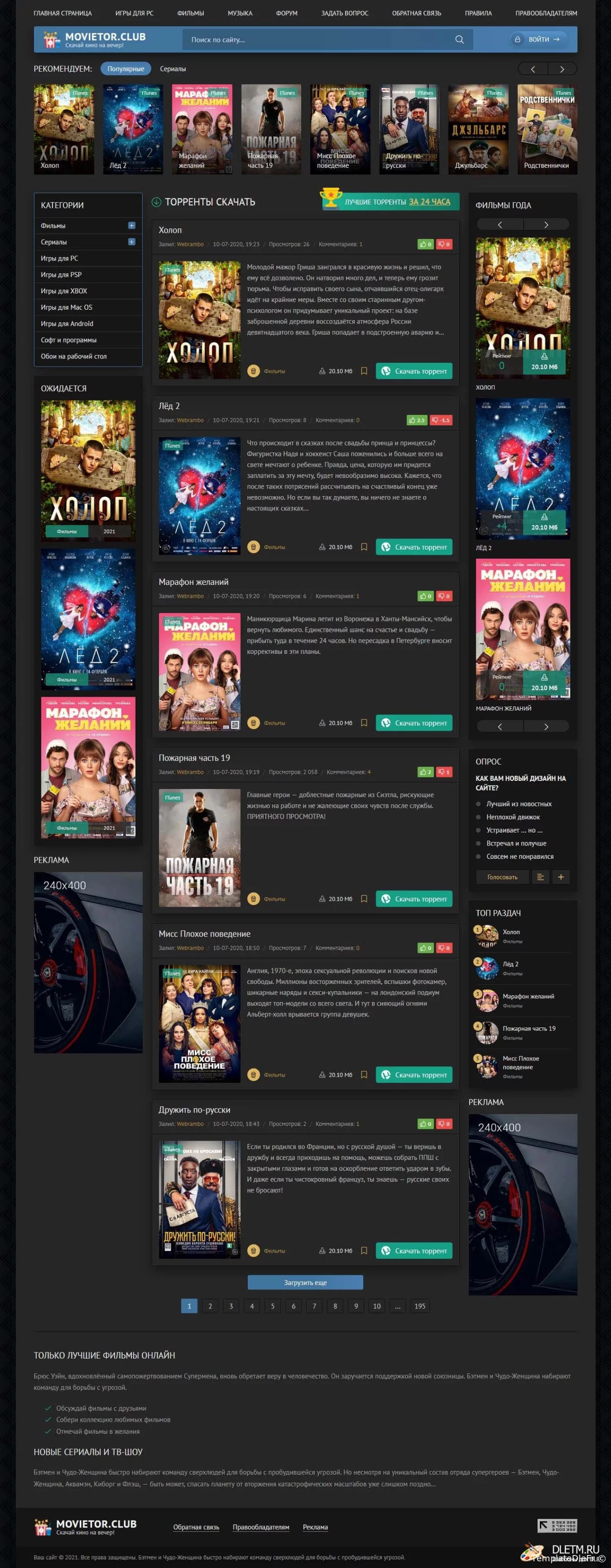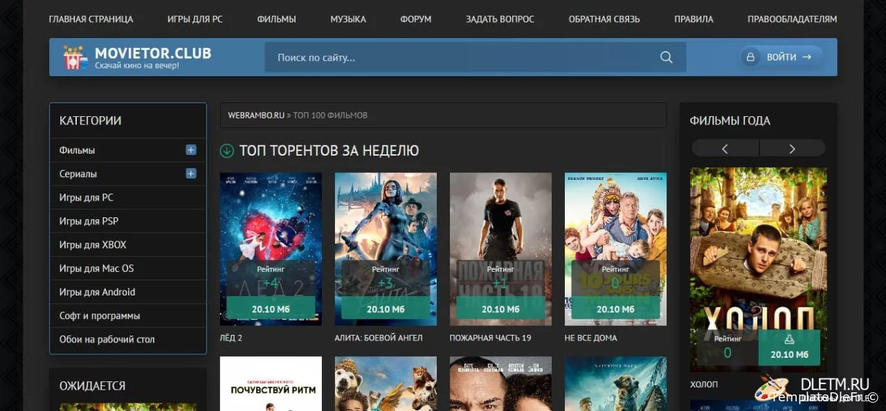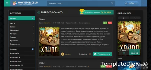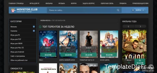 Je vous présentes un autre modèle de film adaptatif de haute qualité et magnifique MOVIETOR pour DLE 17.1, créé pour le torrenting dans des couleurs sombres, les couleurs principales sont le gris, le gris foncé et le bleu, rendu de très haute qualité sans code inutile ni déchets inutiles, un minimum de styles et scripts. La conception est conçue dans une structure à 3 colonnes, ce qui la rend très appropriée pour une utilisation sur ce sujet pour ajouter de nombreux blocs nécessaires dans la barre latérale. Il y a aussi un menu horizontal supérieur mais sans éléments déroulants, en dessous se trouvent le logo, la recherche et le profil utilisateur, ce qui est très pratique en termes d'utilisation et de gain de place ; les blocs latéraux contiennent également un carrousel à 3 éléments. Le modèle MOVIETOR pour DLE est une très bonne solution pour créer votre propre projet de film basé sur un tracker torrent pour télécharger des films ou simplement des films, le modèle lui-même a été entièrement adapté par nos soins et toutes les erreurs et lacunes que nous avons pu trouver lors l’adaptation a été éliminée.