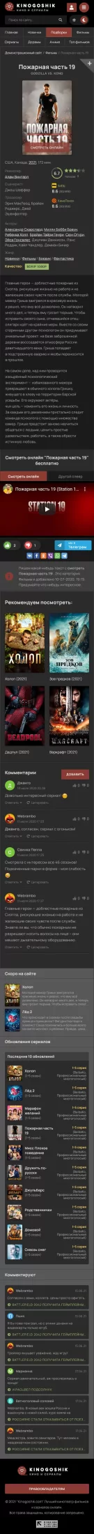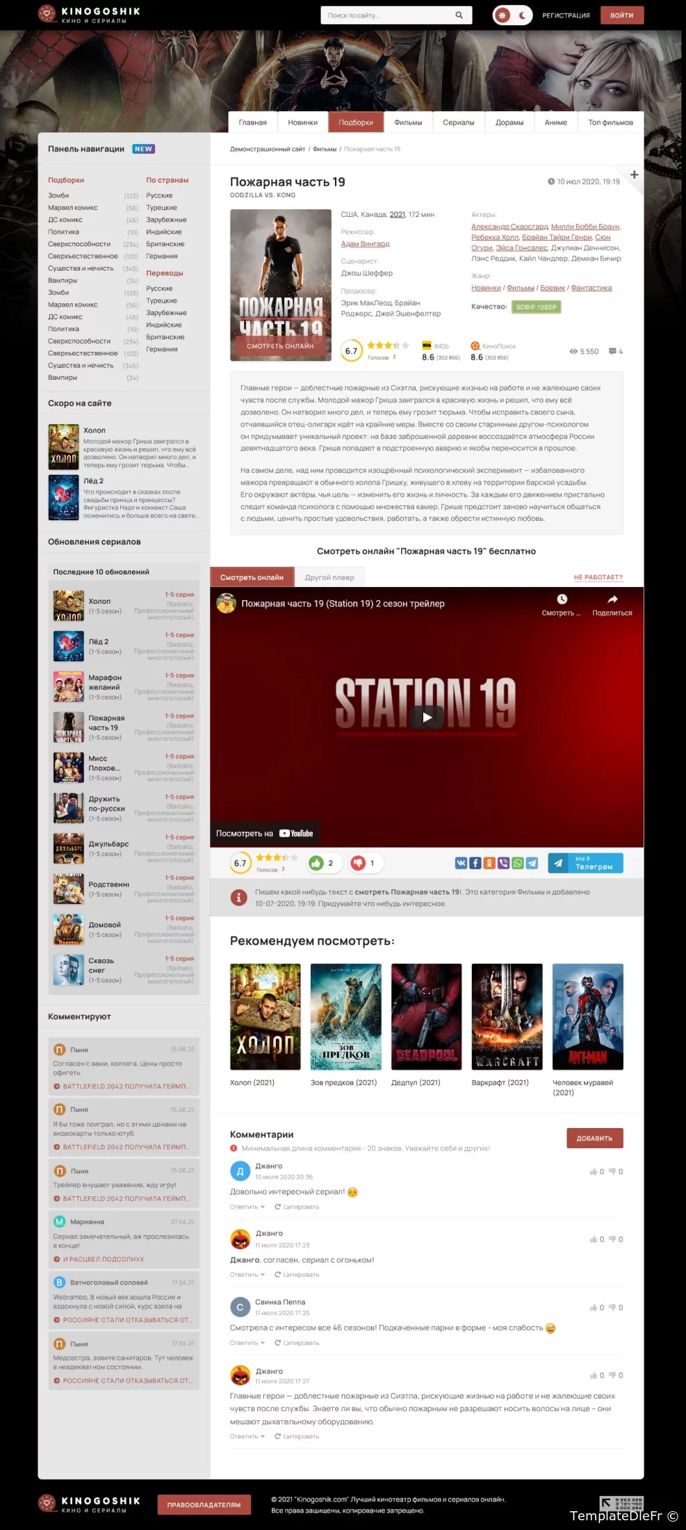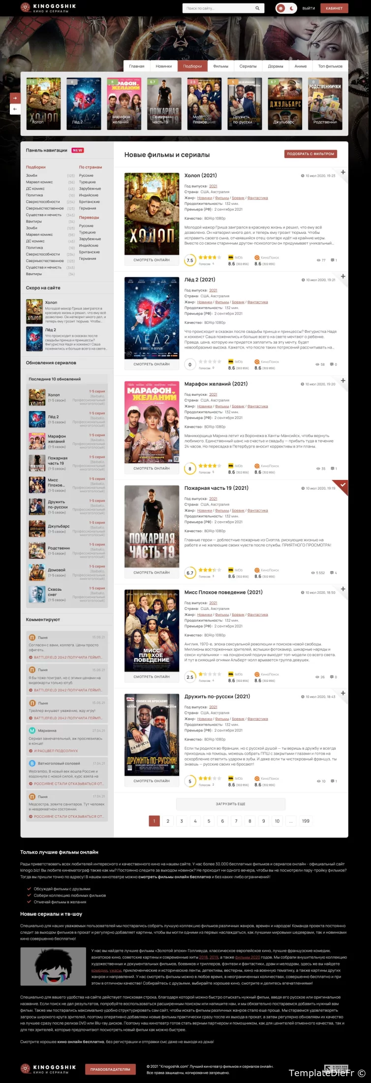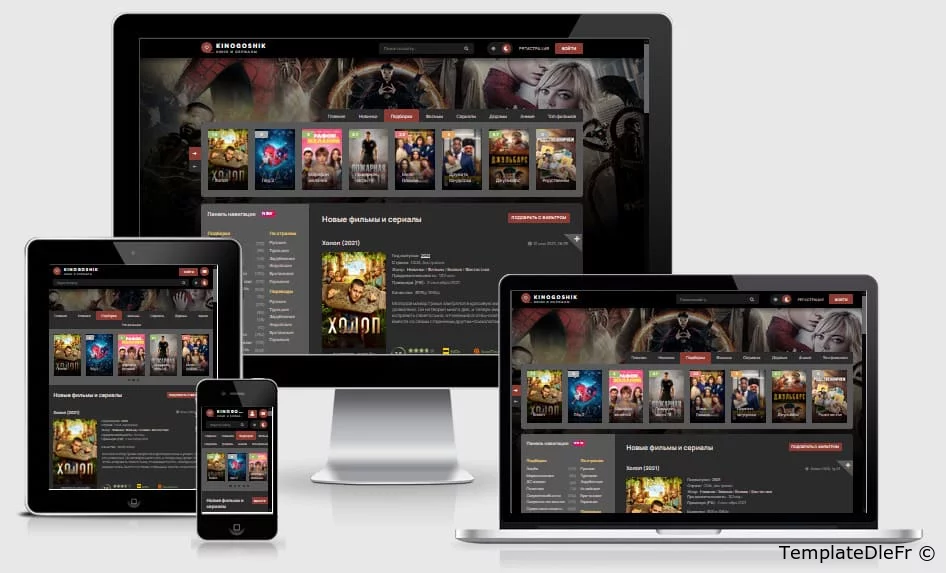 Le modèle Kinogoshik est conçu dans un style classique : un design en niveaux de gris foncé et une courte carte d'informations étendue avec des informations de base. Comme vous pouvez le deviner, il s'agit d'une variation de conception sur le thème du site populaire et le plus ancien sur le thème des "films et séries". Une caractéristique distinctive de ce modèle est le sélecteur de couleur de modèle intégré, sinon tout est assez ordinaire et traditionnel.Tests Google PageSpeed :- page principale : 76-86 smartphones 86-96 ordinateurs de bureau. CLS : 0-0.03.- page avec player : 80-86 smartphones 84-96 desktops. CLS : 0-0.03.PRINCIPALE ET PAGE PRINCIPALE- Basculez rapidement la couleur du modèle de sombre à clair lorsque vous cliquez sur le bouton dans l'en-tête. Le changement se produit "à la volée" sans recharger la page et est mémorisé dans le navigateur de l'utilisateur. Le modèle est sombre par défaut.- Le logo est du texte, entrez simplement le texte dans main.tpl et le logo change. Le modèle utilise également des - variables CSS pour la couleur et les tailles de base. Vous pouvez changer les couleurs en quelques clics sans avoir aucune connaissance !- Carrousel de nouveautés populaires (par défaut pour la semaine). Et dans la catégorie, les plus populaires de cette catégorie particulière sont affichés. Sur l'affiche, l'évaluation des utilisateurs du site sur une échelle de 10 points est colorée en couleurs selon l'évaluation. Par défaut gris, rouge, orange, vert.- Une page séparée des 100 meilleurs films et émissions de télévision, il n'y a qu'une vue des affiches en rangées.- Conception prête à l'emploi pour le module de filtrage sans scripts - la vitesse est plus élevée. Dans le formulaire sont disponibles : des sélections, des champs de texte pour la saisie, des boutons radio. Le module lui-même n'est pas inclus, mais vous pouvez l'acheter chez nous séparément.- Le modèle utilise une note "j'aime pas". Et les étoiles sont une telle variante de la note en pourcentage, ce n'est pas une note de type "score". Vous pouvez également voir un joli graphique circulaire et un score global.- Chargement Ajax de nouveaux matériaux sur le bouton et pagination normale.- Structure d'en-tête intéressante avec des informations sur le film. Sur l'affiche, il y a un bouton "regarder en ligne", qui, lorsqu'il est cliqué, fera défiler la page jusqu'au joueur.- Pour les commentaires, s'il n'y a pas d'avatar, alors un avatar est généré avec la première lettre du nom et une couleur aléatoire de l'ensemble donné.