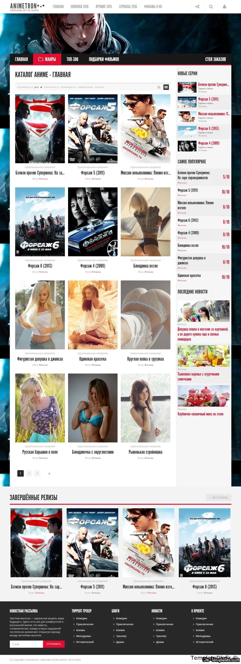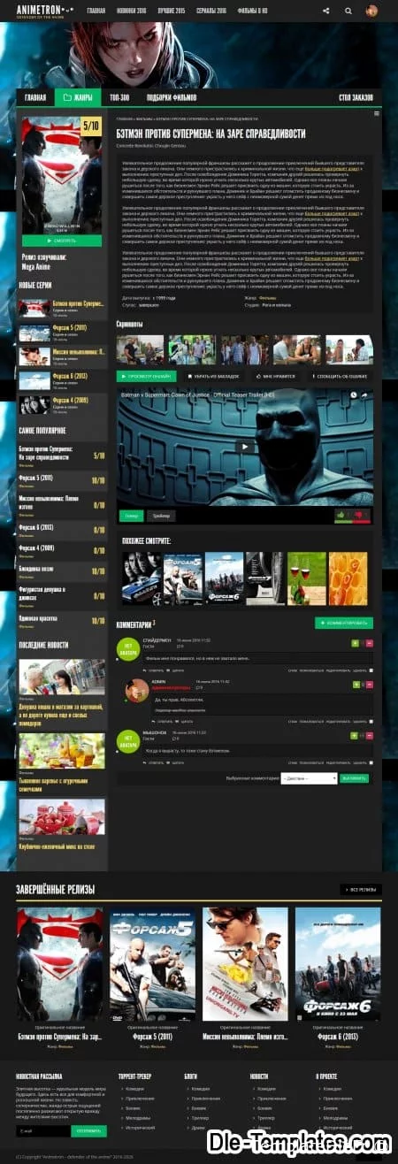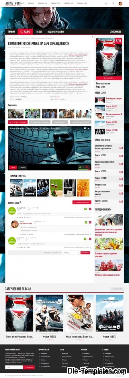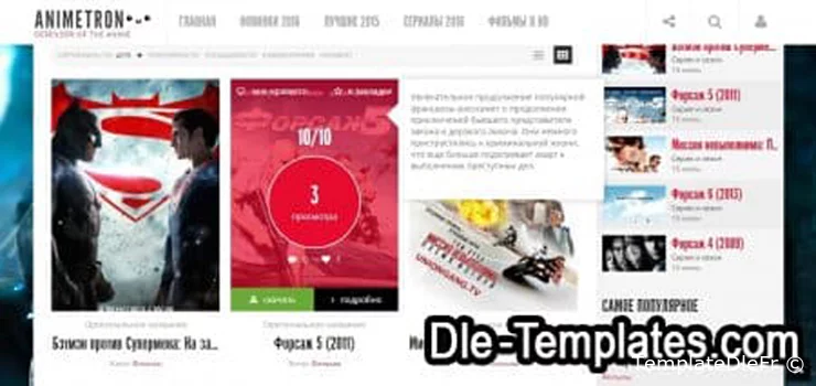 Animetron est un incroyable modèle sur le thème de l'anime pour DLE. Un beau design aux effets non moins beaux ne vous permettra pas de le quitter rapidement des yeux. Qu'est-ce qu'un bon modèle ? Tout d'abord, il est réactif ! Deuxièmement, dans le kit à la fois 2 couleurs - sombres et claires. Troisièmement, le modèle contient tout ce dont vous avez besoin. Il y a un menu déroulant, ainsi qu'un menu avec un choix de genres. Le type de nouvelles passe de l'un à l'autre en appuyant sur un bouton et est mémorisé. Lorsque vous survolez les affiches, une description apparaît, ainsi que d'autres informations nécessaires. Il y a aussi un bouton "regarder" sous l'affiche, quand on clique dessus, on accède immédiatement au player en ligne, ce qui est très pratique sur les smartphones. Modèle d'anime pour DLEa une note moderne sous la forme de goûts et de dégoûts séparés, et la note est affichée sur une échelle de 10 points. Cette note est basée sur la note standard J'aime-Je n'aime pas. En fait, il y a beaucoup à dire. Voir les captures d'écran et la vidéo.