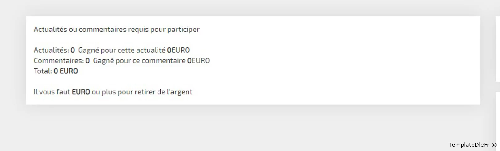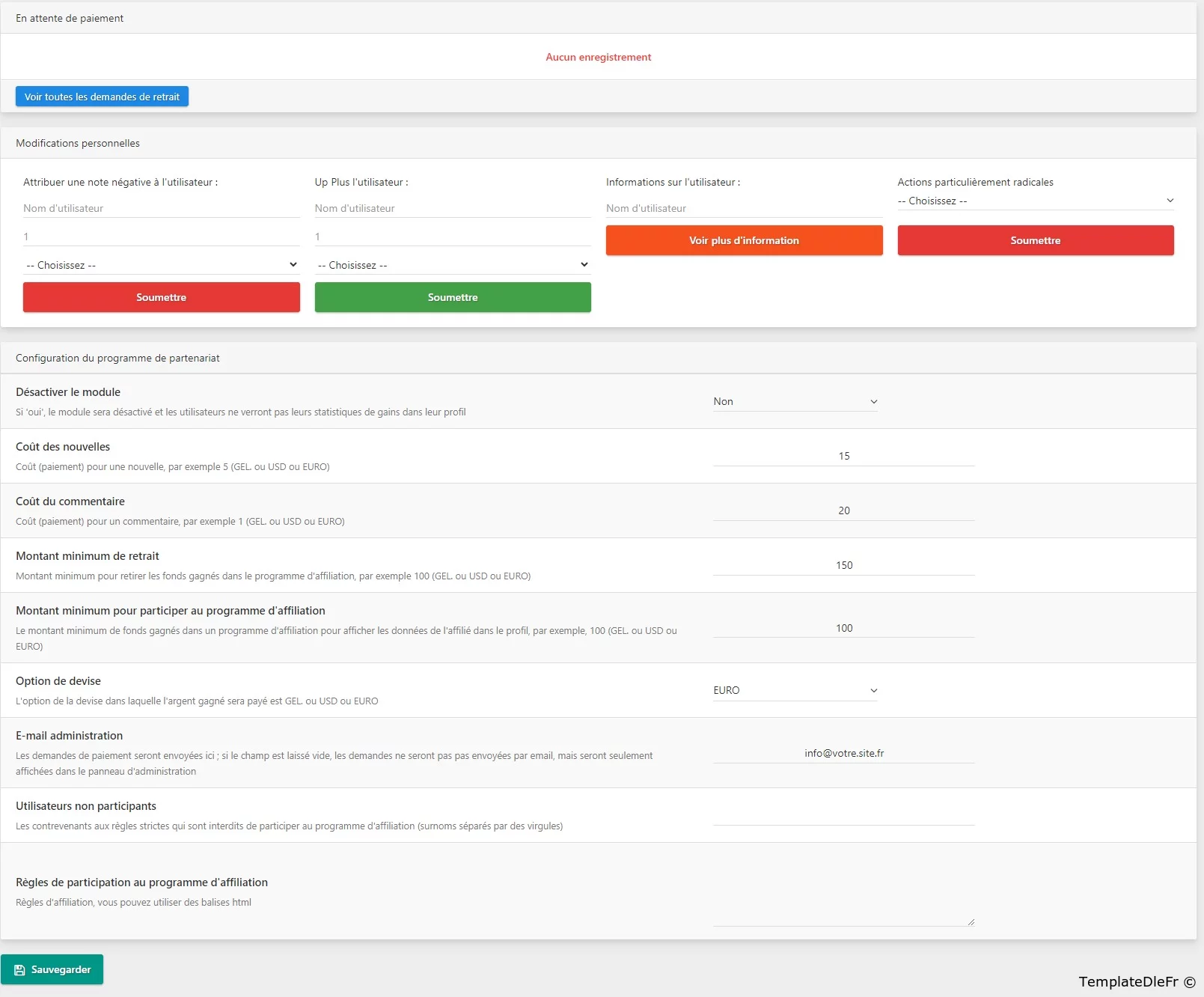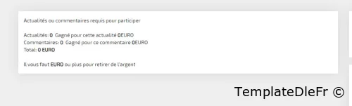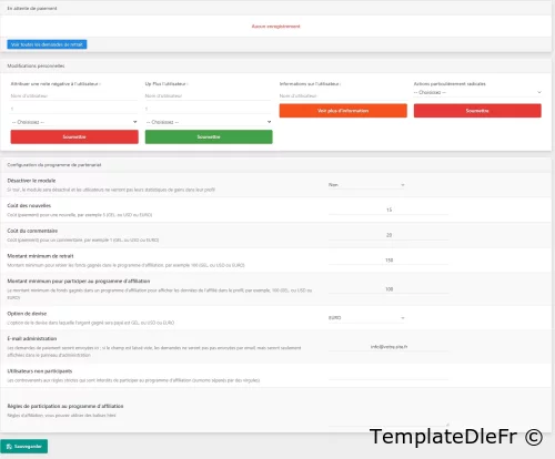 Le module de programme d'affiliation pour DLE, installé via le système de plugins, permet aux utilisateurs du site de recevoir des récompenses pour les actualités et les commentaires.Pour les utilisateurs:-- Crédit automatique d'argent lors de l'ajout d'un commentaire et/ou d'une actualité.-- Réduction automatique du solde lors de la suppression d'actualités et/ou de commentaires.-- Affiche le programme d'affiliation s'il a gagné le montant minimum pour y participer.-- La page d'affiliation affiche des statistiques en temps réel (gains pour les actualités, pour les commentaires)-- Conclusion des règles de participation au programme d'affiliation.-- Lorsque le paiement minimum est atteint, un lien s'affichera pour soumettre une demande de paiement (indiquant où virer et un commentaire sur la demande).-- Indication des détails de la demande soumise - en attente de vérification par l'administrateur ou acceptée pour exécution par l'administrateur (par qui et moment de l'acceptation).-- Envoi d'un message à l'e-mail spécifié dans le panneau d'administration concernant la réception d'une demande de retrait de fonds avec des données à ce sujet (si un tel e-mail est spécifié).Pour les administrateurs du site:-- Crédit automatique d'argent lors de l'ajout d'un commentaire et/ou d'une actualité.-- Moins automatique pour un auteur et cumul pour un nouvel auteur lorsque l'auteur de l'actualité change.-- Fixer le coût de l'actualité et le coût des commentaires.-- Exclusions d'utilisateurs de la participation au programme d'affiliation.-- Ajout d'un nombre spécifié de nouvelles ou de commentaires à un utilisateur sélectionné moyennant des frais.-- Suppression d'un nombre spécifié d'actualités ou de commentaires pour un utilisateur sélectionné moyennant des frais.-- Affichez des informations détaillées sur l'utilisateur et ses réalisations dans le programme d'affiliation.-- Refus massif des demandes de paiement d'argent, effacement de l'historique, réinitialisation de tous les gains, etc.-- Fixation du montant minimum de retrait.-- Fixer un montant minimum pour commencer à participer au programme d'affiliation.-- Paramétrage de la devise de paiement (roubles ou dollars).-- Mise en place (rédaction) des règles de participation au programme d'affiliation.Consultez toutes les demandes de paiement.