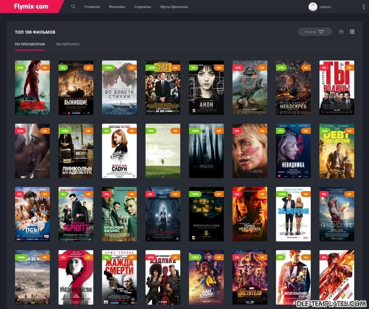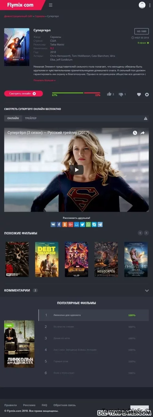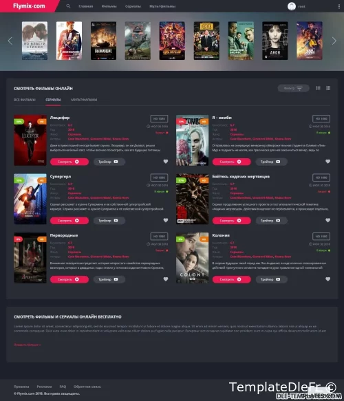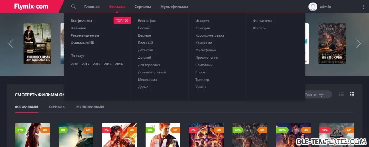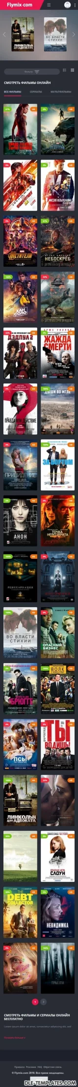 Flymix pour DLE est un excellent modèle adaptatif pour les sites de films avec visionnage en ligne de films, séries, dessins animés, anime. Le modèle est fabriqué dans des couleurs sombres avec des inserts plus brillants qui correspondent parfaitement. Les captures d'écran et les descriptions de tout ne peuvent pas être affichées, alors assurez-vous de regarder la revue vidéo du modèle.Fonctionnalités du modèle:- design réactif moderne (largeur maximale atteint 1650px)- code léger de qualité- compatibilité totale entre navigateurs- divers effets d'animation (live design)- menu déroulant avec les genres- onglets ajax (ne pas encombrer le code)- page top 100 des films par vues et par note- commutateur d'affichage des nouvelles pratique qui fonctionne avec la mémorisation de l'état sélectionnéen bref bouton d'affichage de la bande-annonce dans la fenêtre ajax- informations itinérantes sur le film en bref- toutes les fonctions ajax sont exécutées avec une barre de progression de style youtube- note cool avec des goûts / aversions séparés, un pourcentage et une échelle. En bref des informations sur le film, le pourcentage est affiché, si la note est inférieure à 50%, alors il devient rouge- le modèle ne nécessite aucune modification des fichiers du moteur