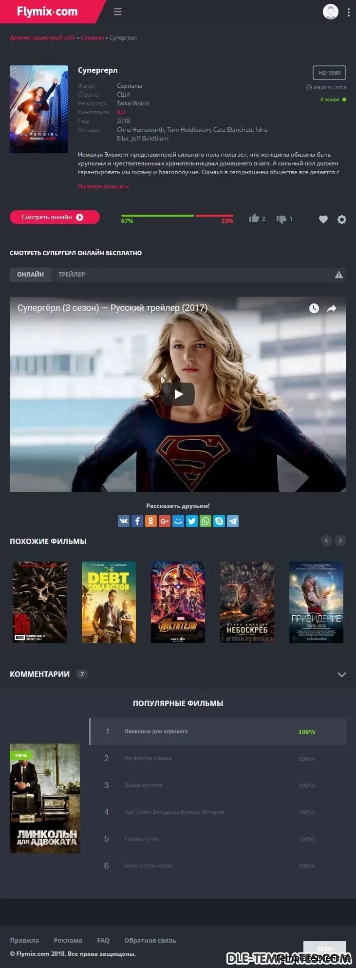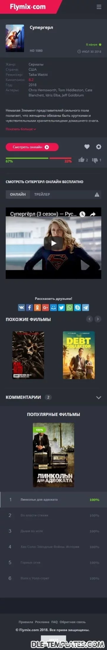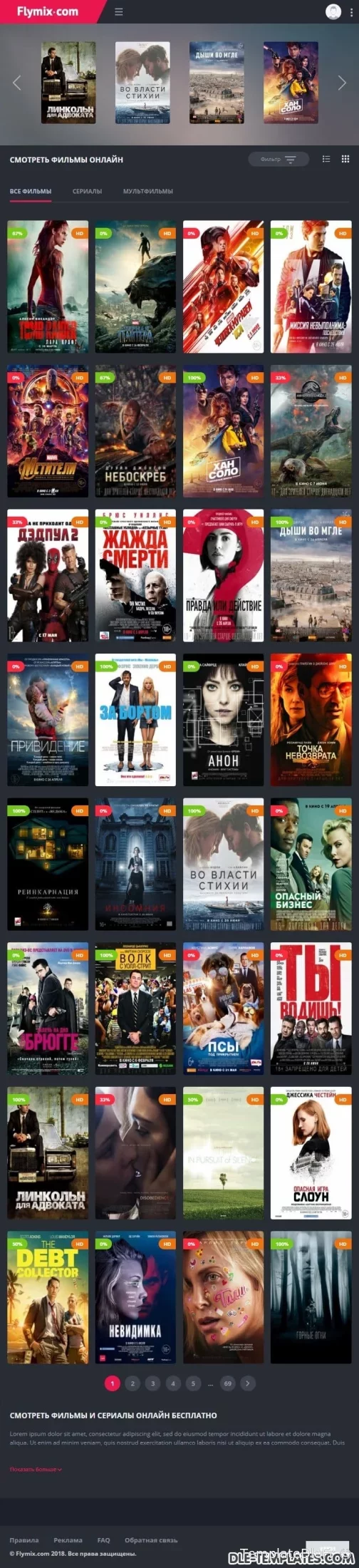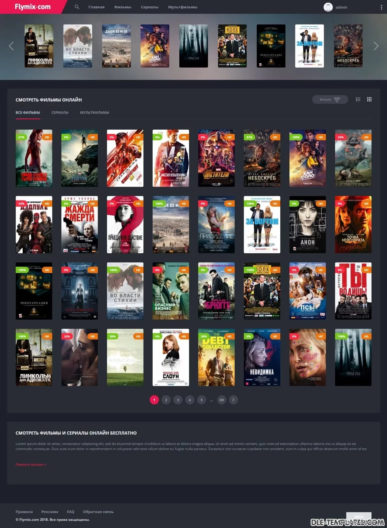 Flymix pour DLE est un excellent modèle adaptatif pour les sites de films avec visionnage en ligne de films, séries, dessins animés, anime. Le modèle est fabriqué dans des couleurs sombres avec des inserts plus brillants qui correspondent parfaitement. Les captures d'écran et les descriptions de tout ne peuvent pas être affichées, alors assurez-vous de regarder la revue vidéo du modèle.Fonctionnalités du modèle:- design réactif moderne (largeur maximale atteint 1650px)- code léger de qualité- compatibilité totale entre navigateurs- divers effets d'animation (live design)- menu déroulant avec les genres- onglets ajax (ne pas encombrer le code)- page top 100 des films par vues et par note- commutateur d'affichage des nouvelles pratique qui fonctionne avec la mémorisation de l'état sélectionnéen bref bouton d'affichage de la bande-annonce dans la fenêtre ajax- informations itinérantes sur le film en bref- toutes les fonctions ajax sont exécutées avec une barre de progression de style youtube- note cool avec des goûts / aversions séparés, un pourcentage et une échelle. En bref des informations sur le film, le pourcentage est affiché, si la note est inférieure à 50%, alors il devient rouge- le modèle ne nécessite aucune modification des fichiers du moteur