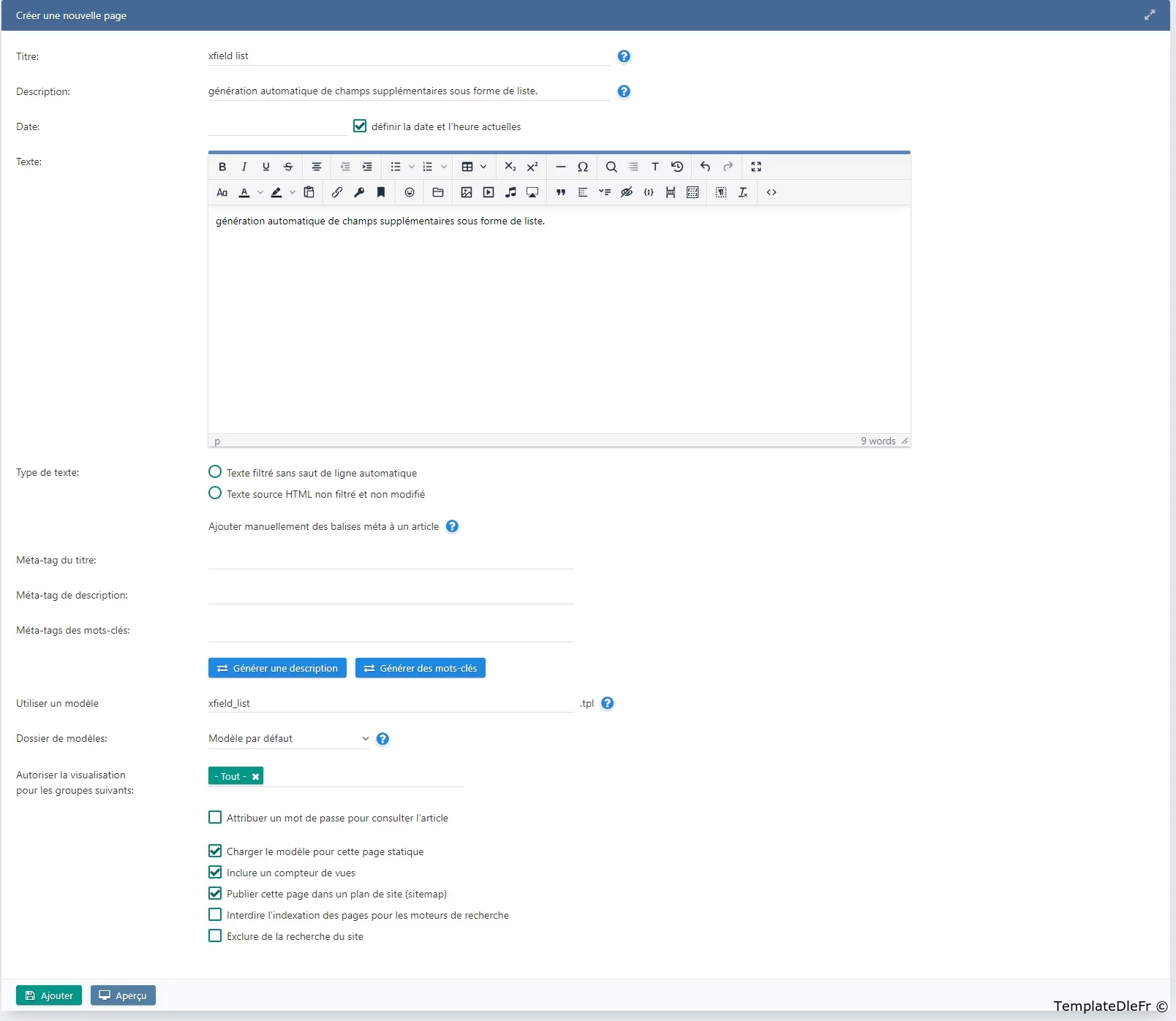 Installation:déposez le fichier xf_list_gen.php dans le dossier moteur/modules ou installez le plugin via le gestionnaire de plugins.Connexion:Le module peut être connecté dans n'importe quel modèle en utilisant: