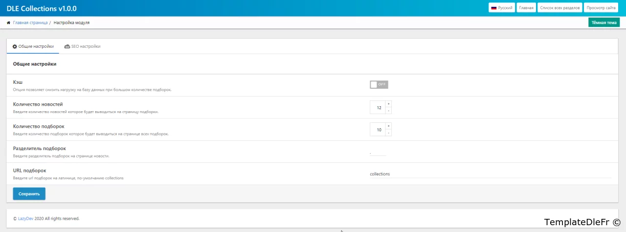 Le module de LazyDev organise un système de collections d'actualités sur divers sujets, dont vous pouvez optimiser les pages pour les moteurs de recherche, les promouvant ainsi dans les résultats de recherche.Caractéristiques du module Collections DLE:1. Possibilité de spécifier votre propre URL pour les collections.2. Ajoutez facilement des collections.3. Possibilité de créer des collections par balise ou valeur de champ supplémentaire.4. Possibilité de fixer une sélection.5. Possibilité de reporter la sélection (ne pas publier immédiatement).6. Ajout d'actualités aux collections lors de leur ajout/modification.7. Possibilité de changer les positions de sélection.8. Prise en charge de tous les éditeurs DLE .9. Prend en charge DLE 13.0 et supérieur.10. Panneau d'administration mis à jour avec prise en charge du thème sombre.11. Balise permettant d'afficher le bloc de sélection à l'emplacement souhaité.12. Une option qui vous permet d'ajouter des collections à une carte XML.13. Prise en charge des langues russe et anglaise dans le panneau d'administration.14. Prise en charge de la balise {sort} pour les actualités au sein d'une collection.Attention! Le module a un design primitif pour afficher toutes les collections et rien de plus. Vous personnalisez vous-même le design de votre site.