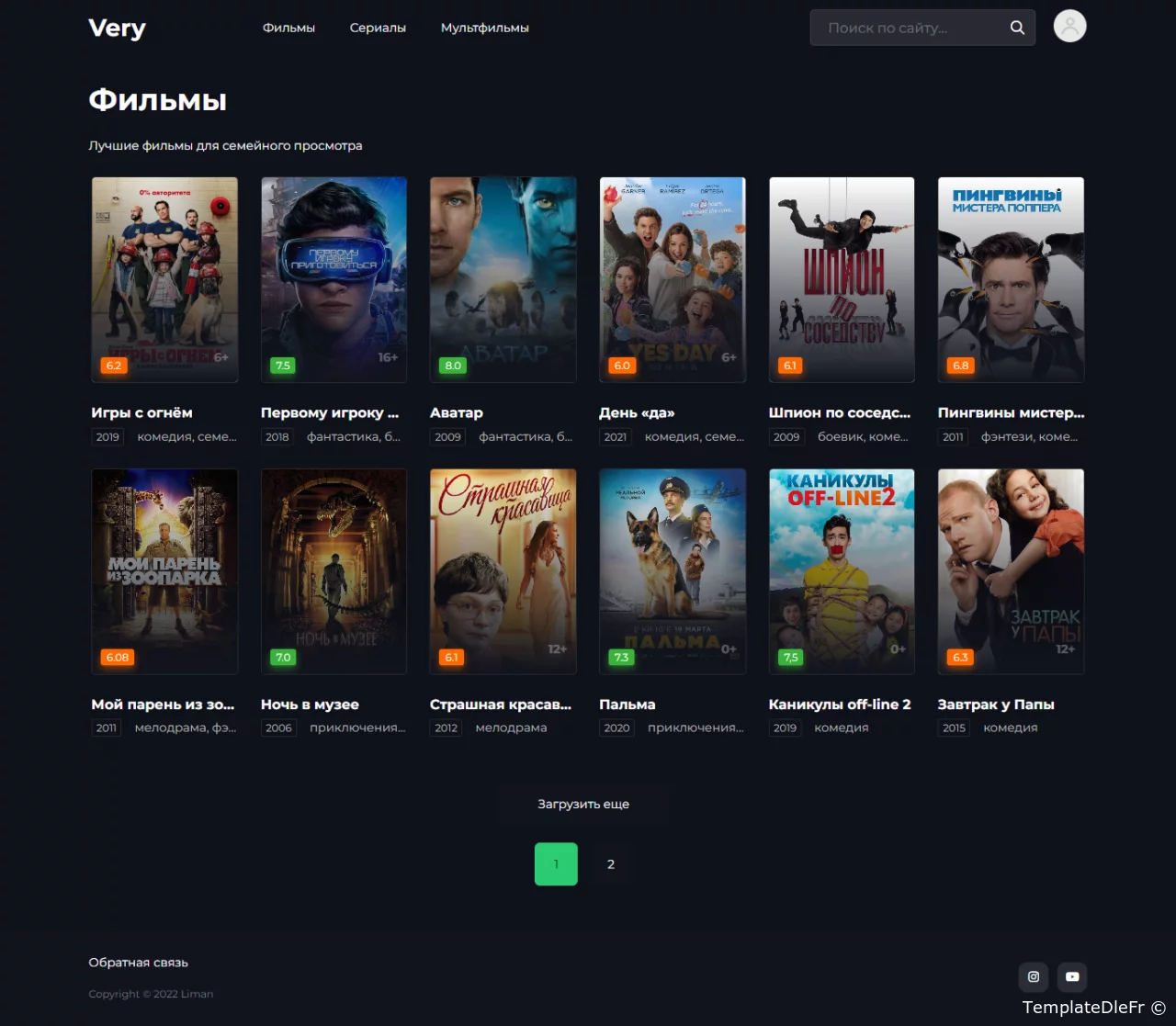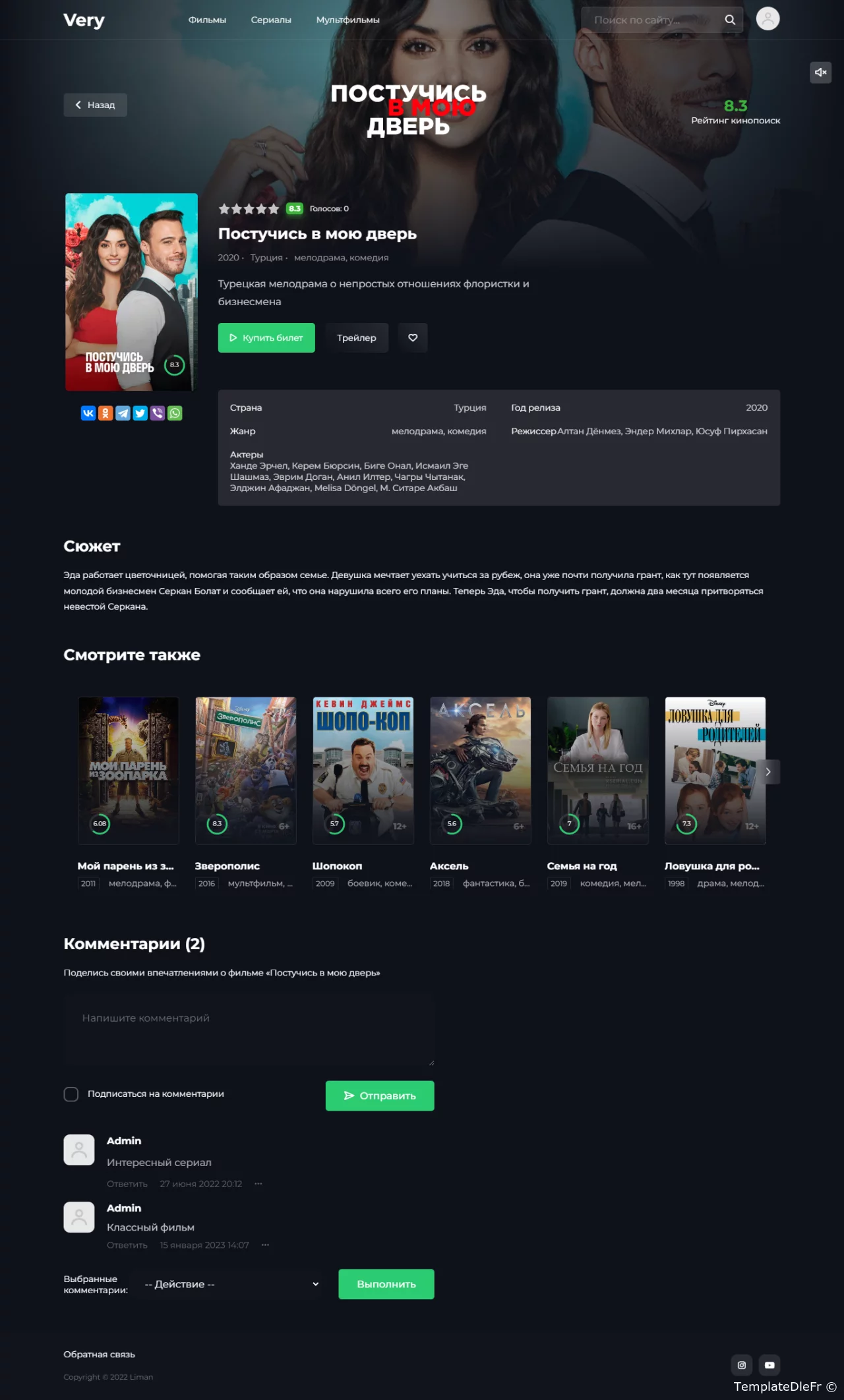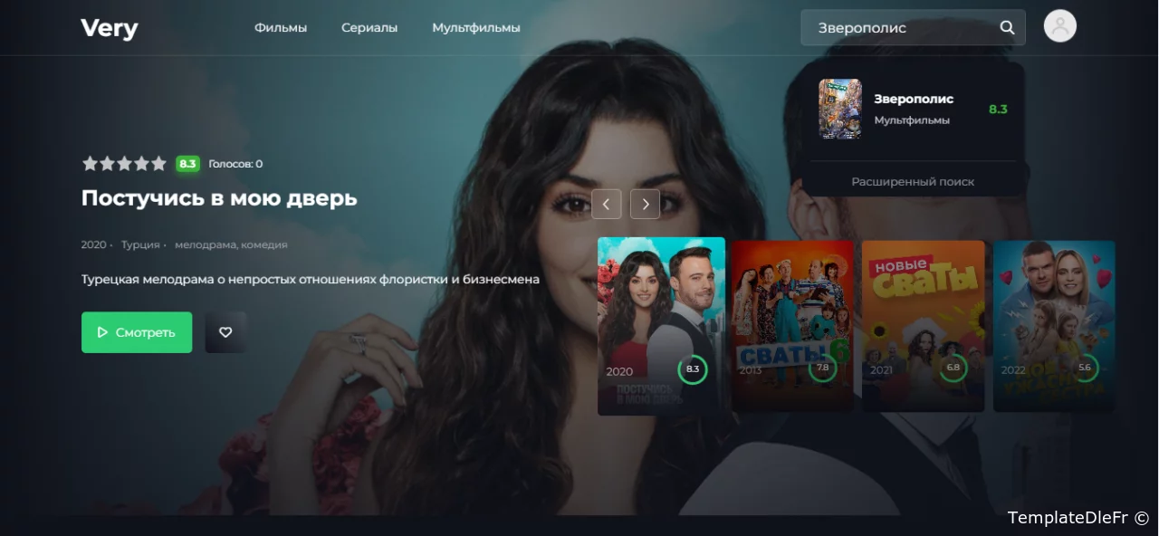 Nous vous présentons un modèle de film adaptatif de haute qualité et magnifique Very pour DLE 15.x, 16.x. Solution unique pour votre blog de cinéma, son style vert foncé donne à votre site une élégance et une personnalité particulière. Il combine un style vert foncé élégant, un magnifique curseur sur la page principale et un design de site Web unique. Le modèle lui-même a été corrigé de toutes les erreurs et lacunes que nous avons. Vous pouvez désormais le télécharger facilement à partir de notre ressource et commencer immédiatement à l'utiliser sur votre projet.1. Style vert foncé: le modèle "Very" offre un design vert foncé élégant qui crée une atmosphère de mystère et attire l'attention des utilisateurs. Cet accent de couleur rend votre site Web de film mémorable et unique.2. Beau curseur sur la page principale: Le modèle "Very" possède un magnifique curseur sur la page principale qui vous permet de mettre en évidence des films importants ou des matériaux recommandés. Ce curseur attire l'attention des visiteurs et crée un aperçu dynamique et attrayant de votre contenu.3. Conception de film unique avec notes et bandes-annonces: le modèle "Very" offre une conception unique pour la page du film. Les classements des films sont présentés dans un format rond avec une belle animation, ce qui les rend attrayants et interactifs. De plus, chaque page de film affiche une bande-annonce avec le logo du film au lieu d'une image d'arrière-plan, ce qui rend le visionnage de films plus excitant et amusant.4. Mobile responsive: le modèle "Very" est entièrement réactif pour les appareils mobiles. Il s'adapte automatiquement aux différentes tailles d'écran, garantissant que votre contenu s'affiche parfaitement sur n'importe quel appareil, qu'il s'agisse d'un smartphone, d'une tablette ou d'un ordinateur. Votre site Web de films sera facilement accessible et utilisable où que se trouvent vos utilisateurs.