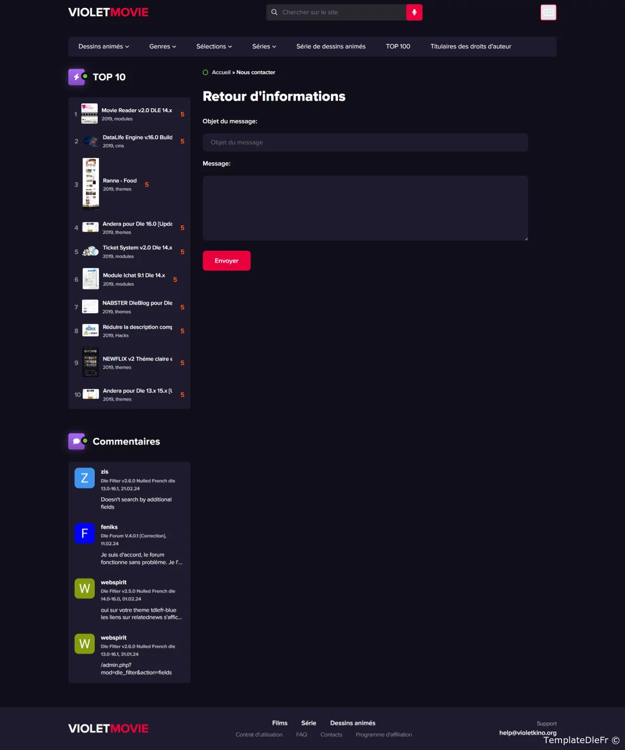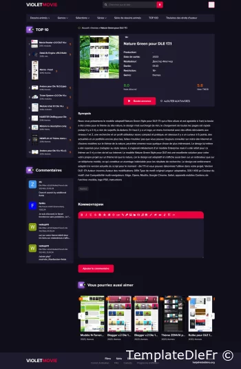 Le modèle "Violet" pour Dle 15.x 17.1 est un voyage dans l'ère du vieux modernisme et des vieux portails de cinéma. Il vous invite à profiter de la sophistication et de l'élégance du siècle dernier et à créer un magnifique portail de cinéma.Principales caractéristiques du modèle "Violet":1- Ancien Art Nouveau: Le modèle Violet propose un style Ancien Art Nouveau qui incarne l'élégance et la sophistication du siècle dernier. Cela nous ramène à une époque où les portails de cinéma avaient un attrait particulier et un charme unique. Ce modèle vous plongera dans l'atmosphère du vieux Hollywood et vous permettra de créer une expérience visuelle unique pour vos visiteurs.2- Amour du détail: Le modèle Violet accorde une attention particulière aux détails qui le rendent spécial et unique. Des pignons gracieux aux ornements et motifs, chaque élément de design incarne le modernisme ancien et apporte de la sophistication à votre expérience cinématographique. Les amateurs de détails anciens apprécieront la splendeur et l’attention méticuleuse aux détails de chaque élément de ce modèle.3- Sophistication et élégance: Le motif Violet respire la sophistication et l'élégance, qui s'imprègnent dans chaque partie de celui-ci. La palette de couleurs combine des nuances de violet, lilas et rose pâle, créant une harmonie visuelle. La composition et la typographie reflètent également la sophistication et ajoutent une touche de charme rétro.