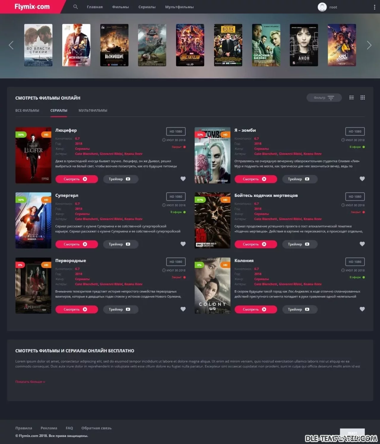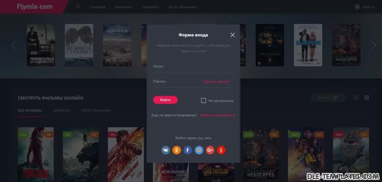 Flymix pour DLE est un excellent modèle adaptatif pour les sites de films avec visionnage en ligne de films, séries, dessins animés, anime. Le modèle est fabriqué dans des couleurs sombres avec des inserts plus brillants qui correspondent parfaitement. Les captures d'écran et les descriptions de tout ne peuvent pas être affichées, alors assurez-vous de regarder la revue vidéo du modèle.Fonctionnalités du modèle:- design réactif moderne (largeur maximale atteint 1650px)- code léger de qualité- compatibilité totale entre navigateurs- divers effets d'animation (live design)- menu déroulant avec les genres- onglets ajax (ne pas encombrer le code)- page top 100 des films par vues et par note- commutateur d'affichage des nouvelles pratique qui fonctionne avec la mémorisation de l'état sélectionnéen bref bouton d'affichage de la bande-annonce dans la fenêtre ajax- informations itinérantes sur le film en bref- toutes les fonctions ajax sont exécutées avec une barre de progression de style youtube- note cool avec des goûts / aversions séparés, un pourcentage et une échelle. En bref des informations sur le film, le pourcentage est affiché, si la note est inférieure à 50%, alors il devient rouge- le modèle ne nécessite aucune modification des fichiers du moteur