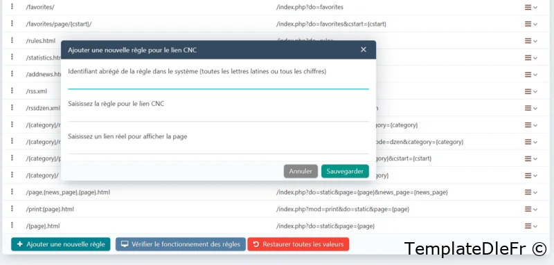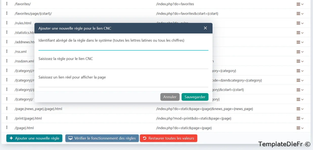 2. Une nouvelle section a été ajoutée au panneau de commande DataLife Engine, où vous pouvez gérer toutes les règles d'URL SEO-friendly à votre discrétion et créer l'apparence des adresses pour les publications et les sections de site que vous préférez. Vous pouvez modifier directement toutes les règles du panneau de contrôle selon lesquelles elles fonctionneront. Vous pouvez modifier les règles existantes et en ajouter de nouvelles. Cette section comprend la prise en charge de la vérification de l'exactitude des règles. La documentation de DataLife Engine fournira des renseignements plus détaillés sur la façon de travailler avec cette section. De plus, dans le cas où vous faites des erreurs et que vous ne savez pas comment les corriger, il est possible de revenir rapidement aux valeurs par défaut. Vous pouvez réinitialiser une seule règle ou toutes les règles en même temps. Cependant, soyez extrêmement prudent, car cette section nécessite une expérience et une compréhension particulières de ce que vous faites. Vous devez également comprendre que si les pages ont déjà été indexées par les moteurs de recherche, modifier l'apparence des liens sur le site entraînera une perte temporaire de ces pages à partir de l'index de recherche jusqu'à ce que les moteurs de recherche réindexent le site, ce qui abaisse le classement du site dans le système de recherche.