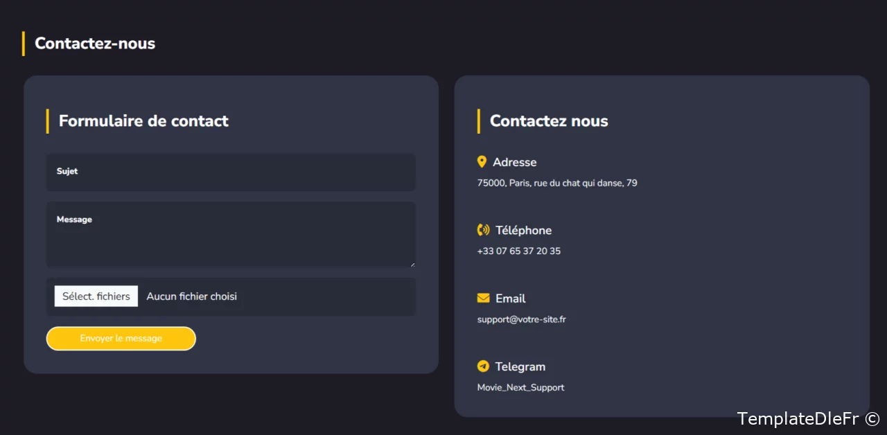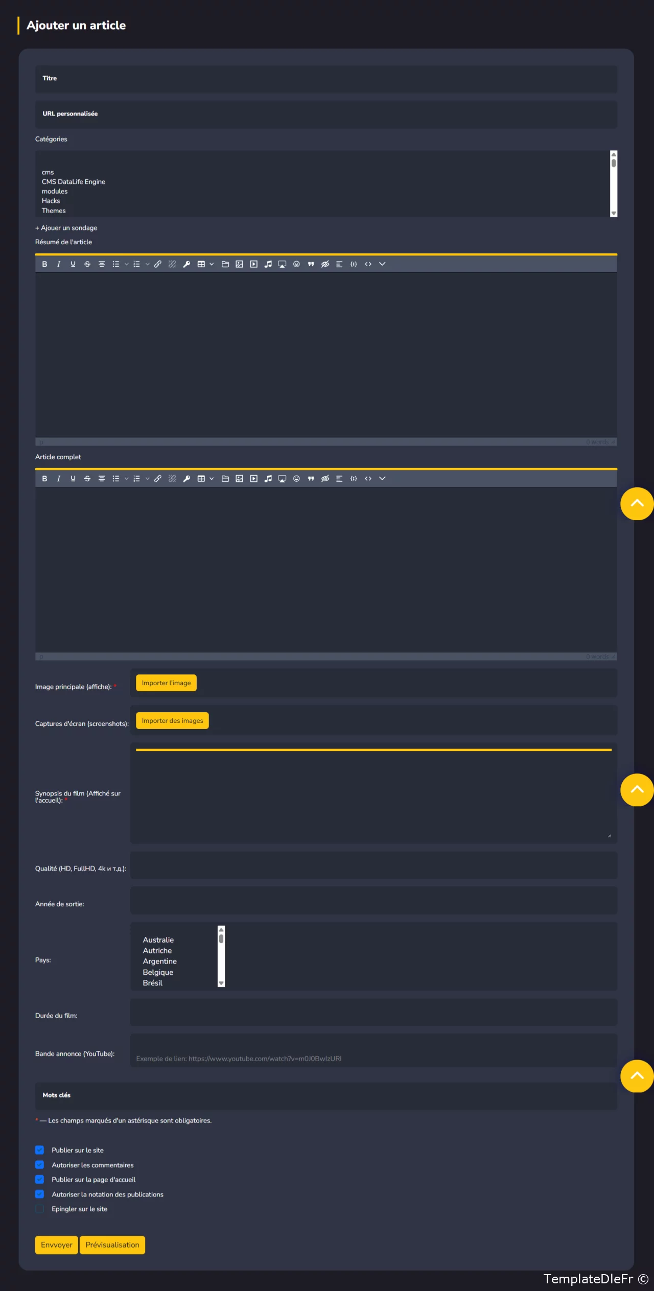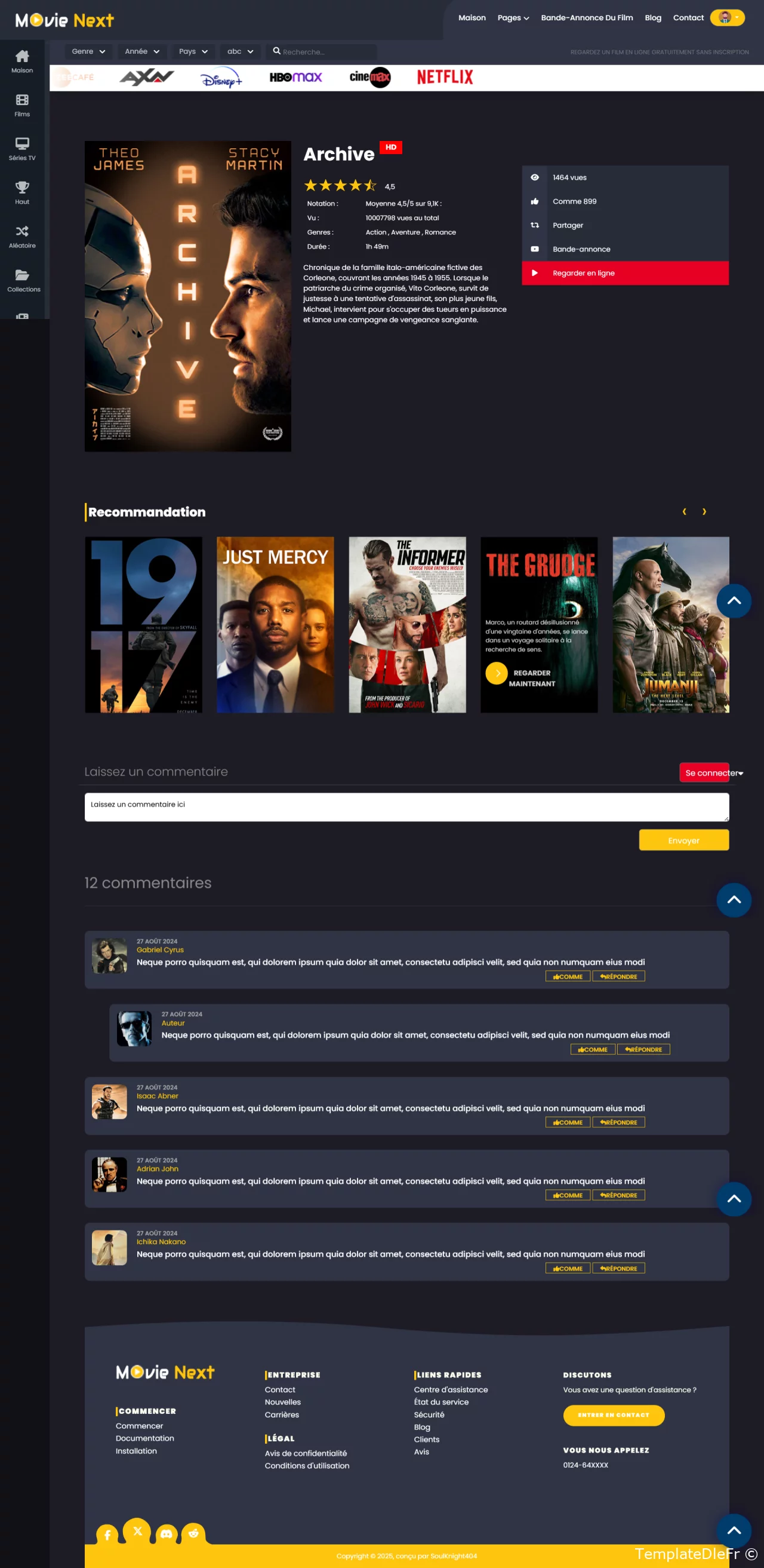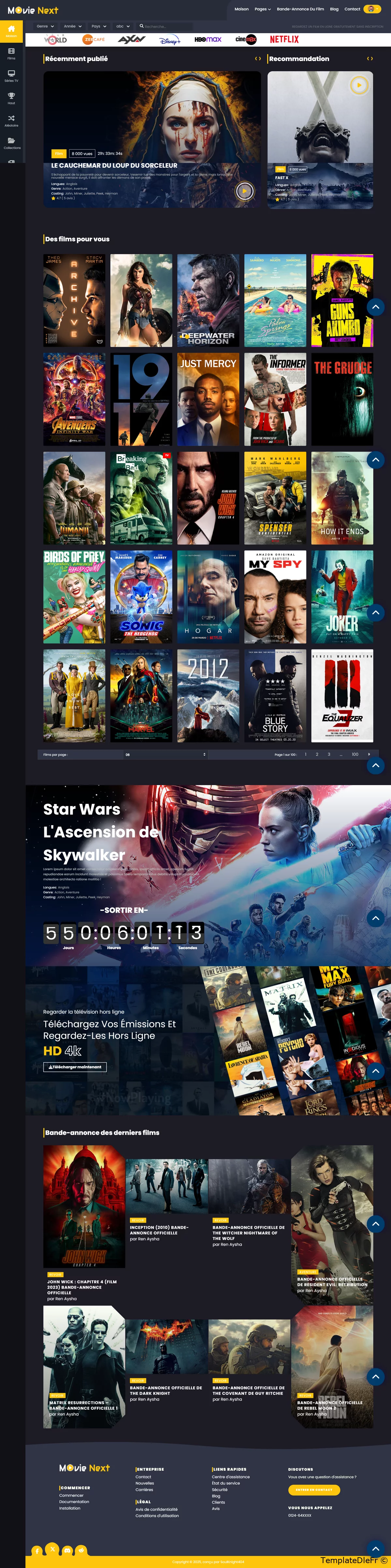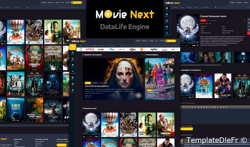 Instructions pour l'installation :1. Telecharger le modele2. Envoyer le dossier templates à la racine de votre site3. Installez le plugin supplementaire "Gallery Preview (LightGallery).xml" depuis le dossier Plugins.4. Dans les "Parametres du systeme", specifiez le modele de site "Movie-Next"5. Effectuez toutes les editions et modifications (si necessaire) comme d'habitude, dans la section "Gestions des modeles" -> "Modele du site".6. Pour utiliser le fichier 404.html, mettez le à la racine du site puis allez dans l'administrationadmin.php?mod=options&action=syscon dans configuration générale et plus bas trouvez "Utilisez une page distincte pour l'erreur 404" et activez lePS: si vous n'etes pas habitué avec la partie "5", vous pouvez utiliser NotePad++ pour modifier le modele.Utilisation de la partie Comming Out (Sortie d'un film/série à une date précise avec compte à rebours) dans le fichier templates/Movie-Next/_informers/home_offline.tpl éditez le fichier avec notepad++1. Ouvrez ce fichier et allez à la ligne 104 et supprimez "<!-- Start Coming-Out"2. Ensuite allez plus bas à la ligne 128 et supprimez "Start Coming-Out -->"3. Modifier les informations par ceux que vous voulez mettre et modifier la date data-datetime="2026-01-01 00:00:00"Les champs supplémentaires1. Les champs supplèmentaires sont fournis pour les sites qui n'en n'ont jamais utilisé.1.1. Ouvrez le dossier "champs-supplementaires" et envoyer le fichier "xfields.txt" dans le dossier "engine/data"2. Pour ceux qui utilisent déjà des champs supplémentaires ouvres les fichiers, et modifiez le nom des champs par les votres- fullstory.tpl- shortstory.tpl- _informers\home_publish.tpl- _informers\home_recommend.tpl- _informers\random-movies.tpl- _informers\top-movies.tpl