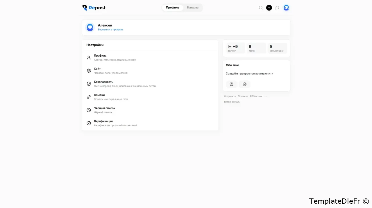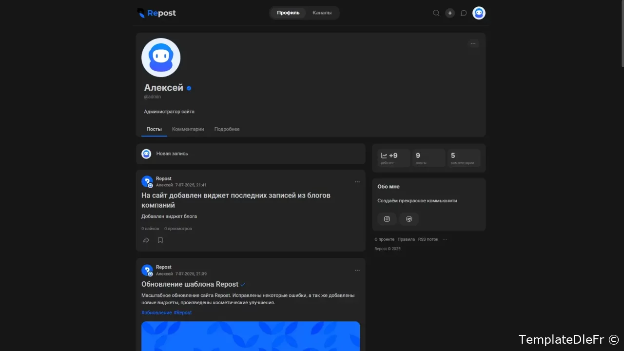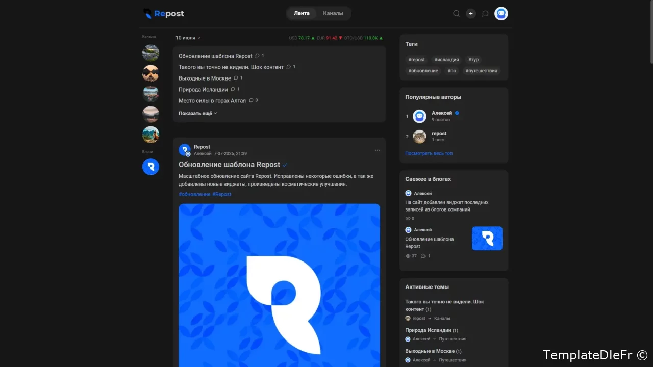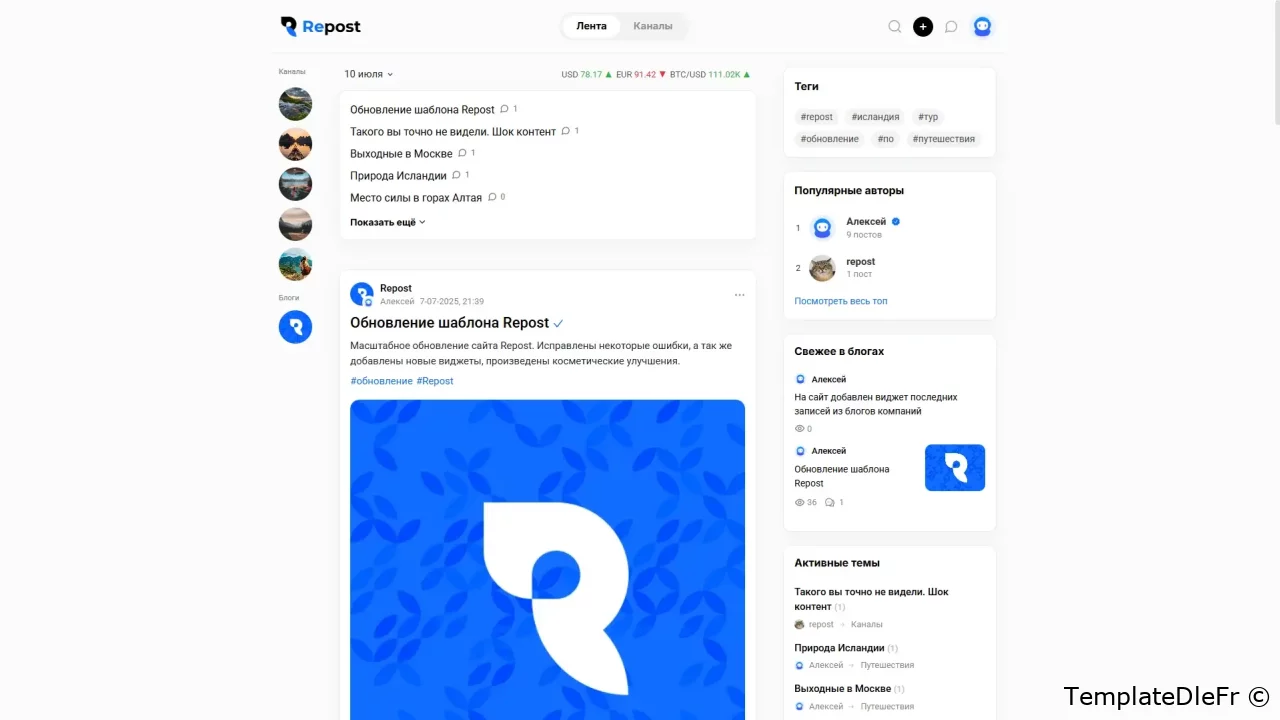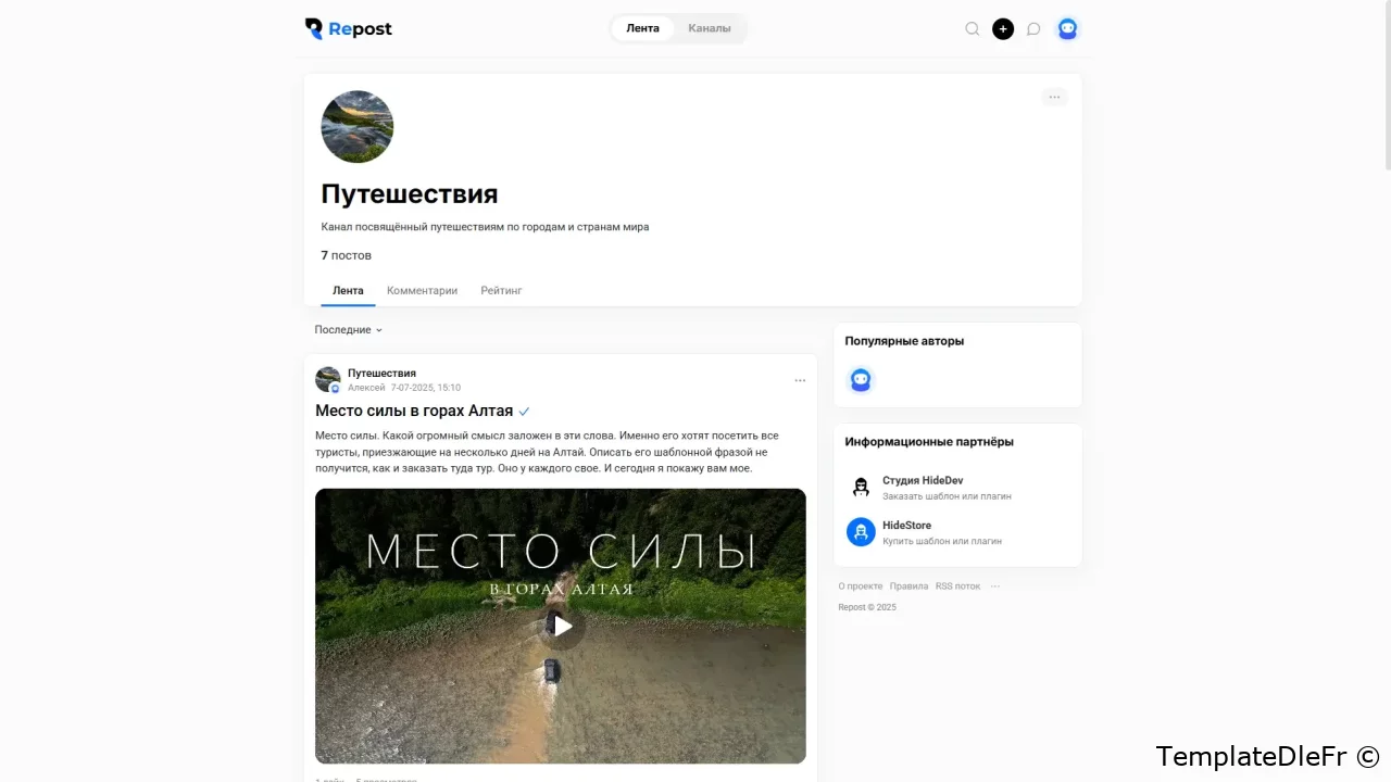 Modèle minimaliste pour la construction de Blog communautaires mettant l'accent sur l'emplacement, les catégories, le travail avec les médias. Repost vous permettra d'organiser immédiatement après l'installation un bac à sable complet pour une variété de sujets de sites. En dehors de la boîte, un ensemble complet de plugins requis pour le bon fonctionnement du modèle est fourni, ainsi que l'extension de la fonctionnalité et l'amélioration des visuels. Selon la structure, le modèle présente des similitudes avec d'autres portails, tels que TJournal, DTF, TProgger et d'autres, où l'accent est mis sur la publication des utilisateurs et la composante sociale. Les catégories sont décorées sous forme de canaux, il y a un profil complet avec les messages d'utilisateurs, une section vidéo séparée, les auteurs de premier plan, l'historique de navigation et bien plus encore. L'accent est mis dans le modèle Repost sur la publication de la chaîne. La page d'ajout d'un post est considérablement pompée en raison des plugins Select2, Tagger, et grâce à la carte de Yandex API, les utilisateurs du site ont la possibilité de spécifier la ville, l'emplacement, les routes de construction.