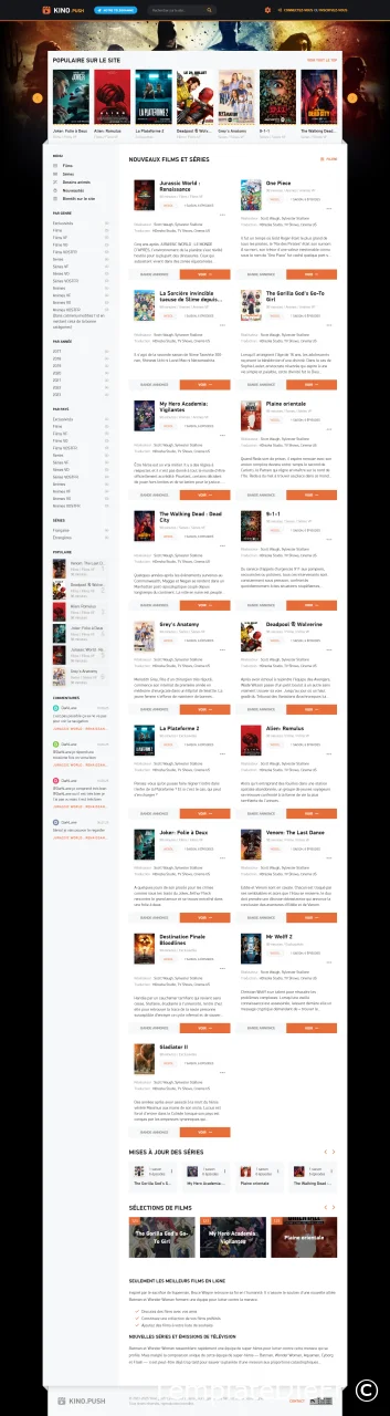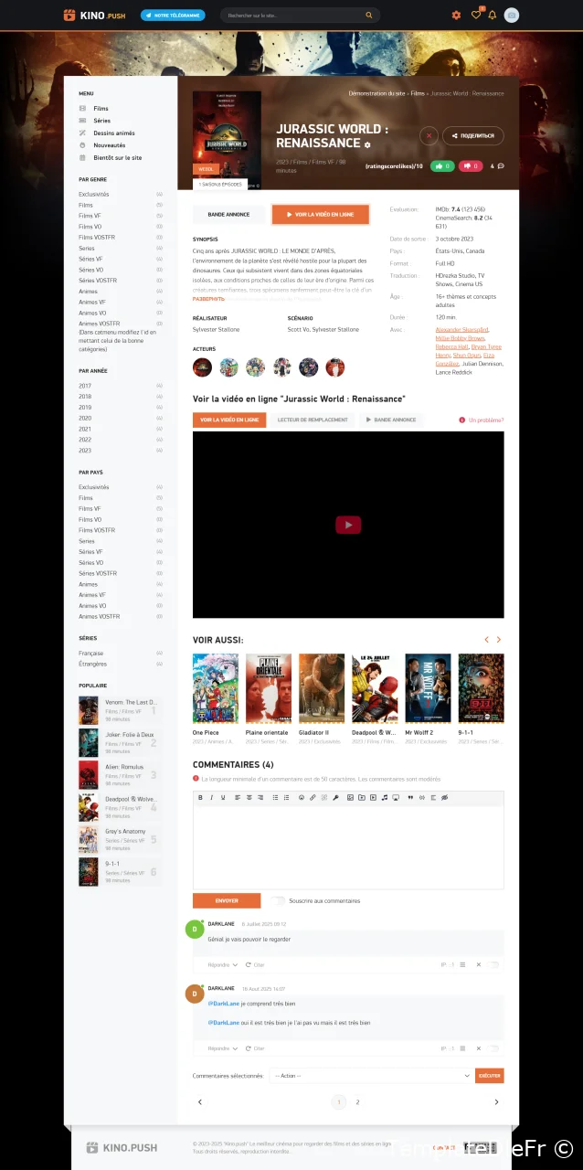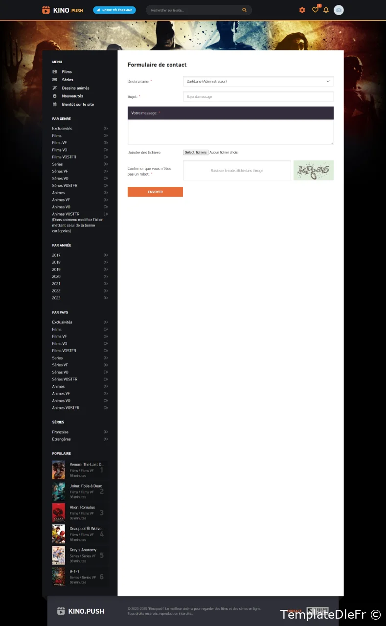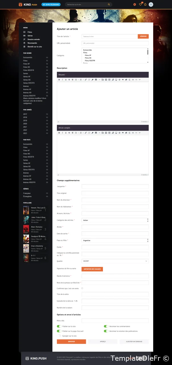 Modèle de cinéma KinoPush pour DLE 16.0 à 18.1- il s'agit d'un modèle unique en termes fonctionnels. Ce modèle a intégré la définition du thème de la prise de vue, ainsi que l'installation de différentes options par défaut. C'est-à-dire que vous pouvez assembler votre conception en différentes versions en tant que concepteur et utiliser sur différents sites. Dans ce cas, le modèle ne perd pas ses qualités à la fois en termes fonctionnels et techniques. Tout fonctionne aussi vite et optimisé.Le modèle est mis à jour.- Ajout de "colonne en bas". Dans ce mode, il y a un menu de boutons fixe comme pour les smartphones avec un appel de menu rapide.- Pour configurer la "colonne à droite", la figure du populaire est transférée à gauche avant l'affiche.- Ajout de réglage "mini-carte".- Ajout de tpl pour les sélections et la sortie des kits à l'essentiel sous la forme d'un carrousel.- Une description détaillée de la façon de modifier les paramètres par défaut est ajoutée à l'instruction.Dépliants mis à jour css, js et fichiers main.tpl, main-settings.tpl. Ajout custom-collection.tpl.Mise en place du modèle