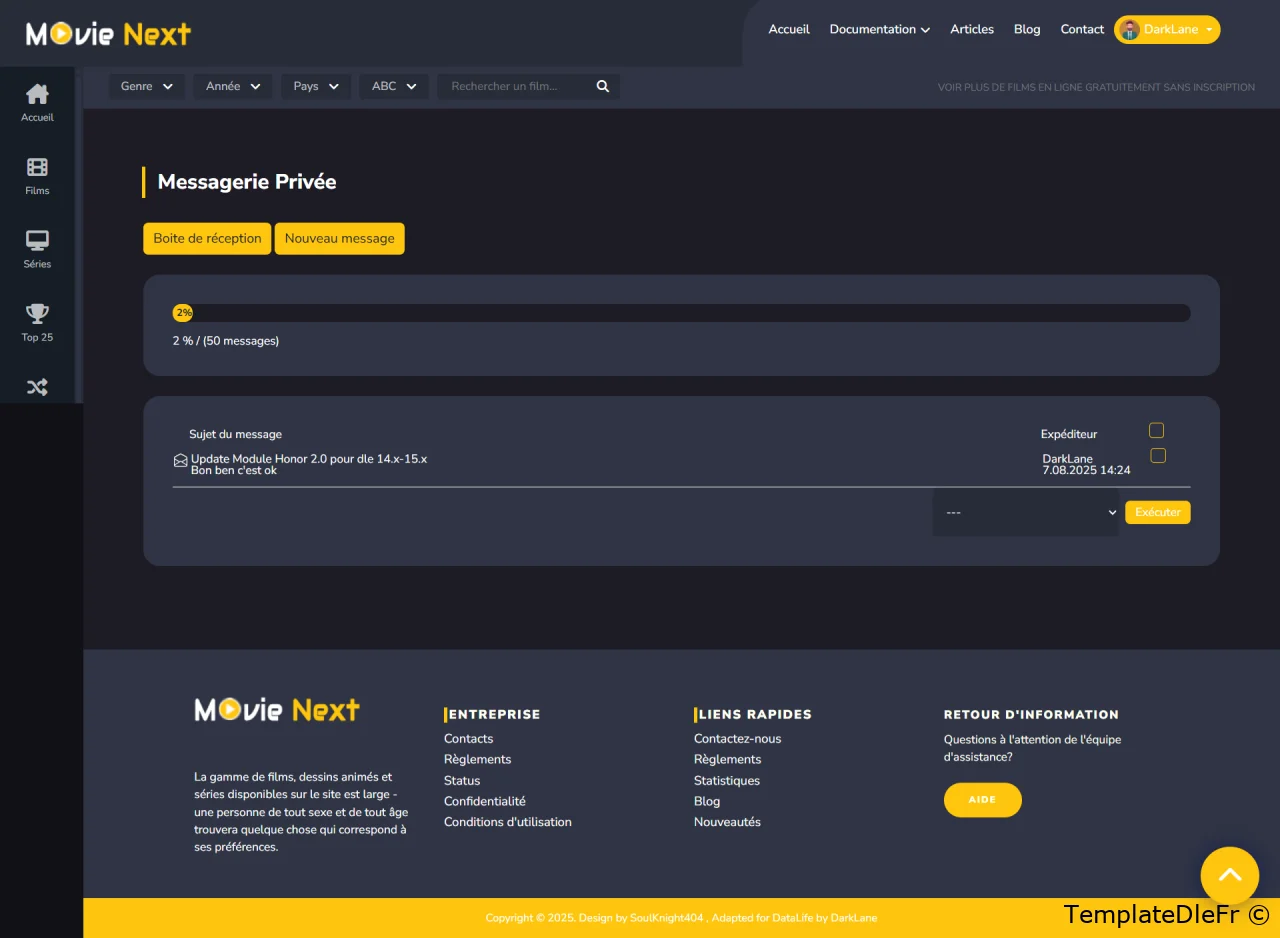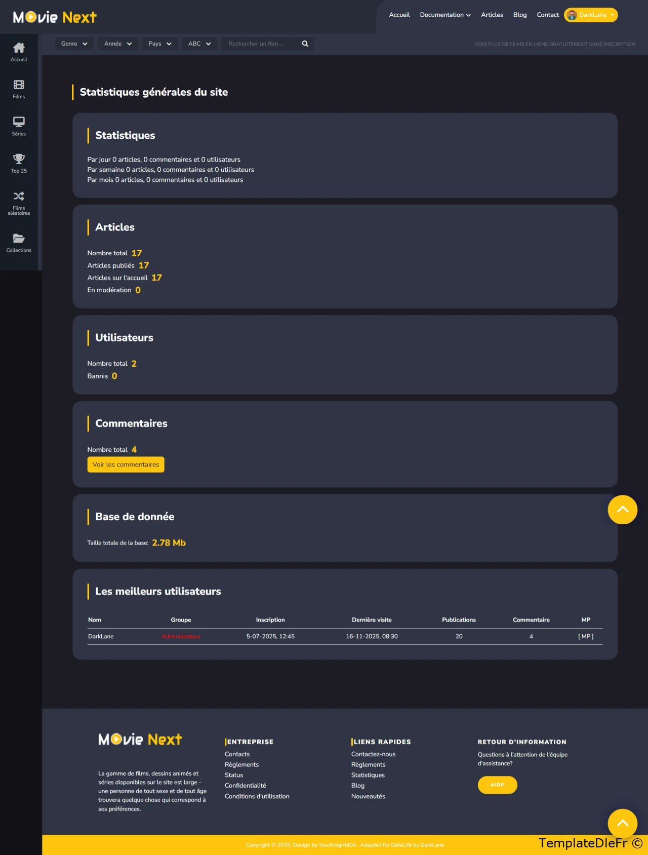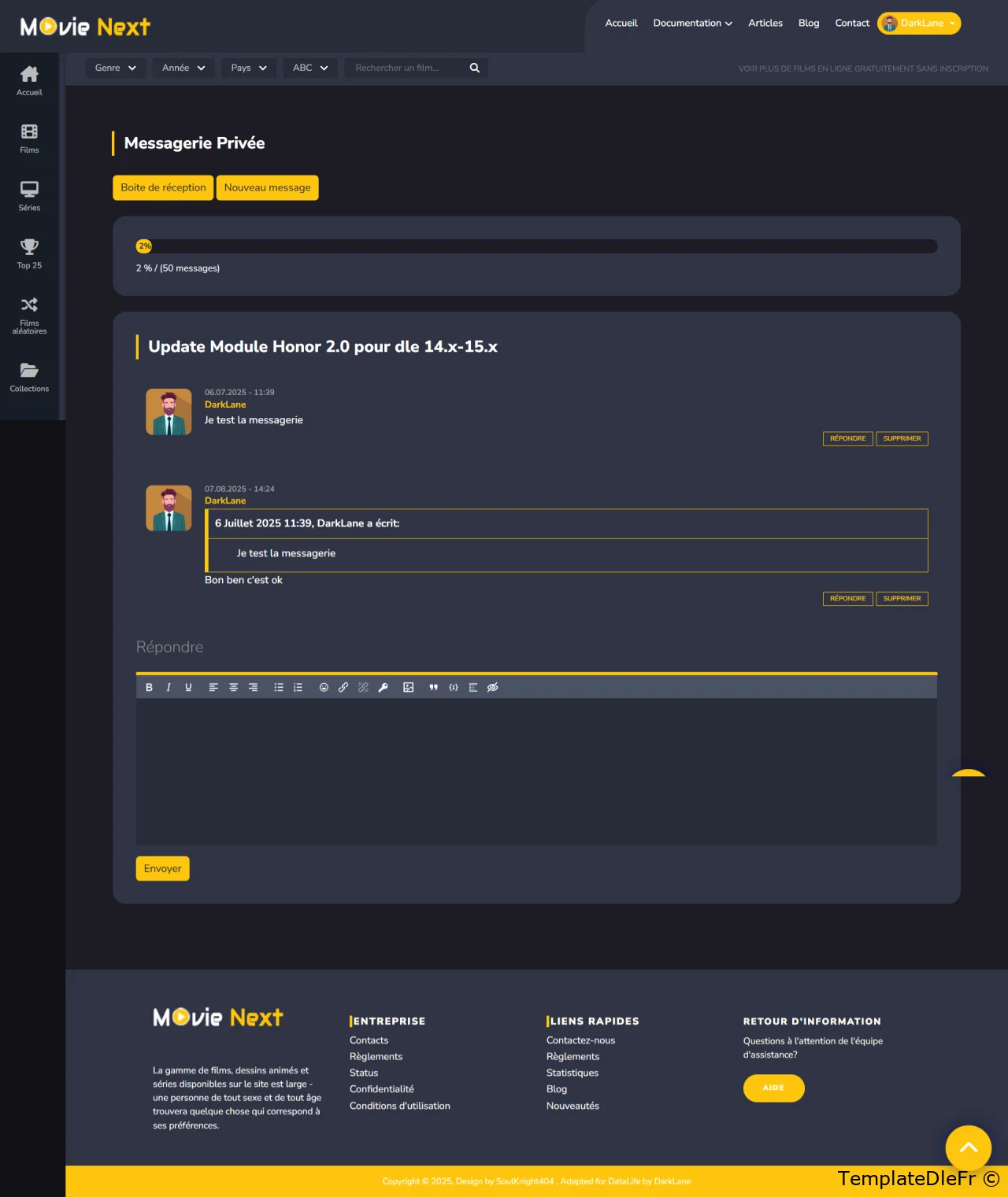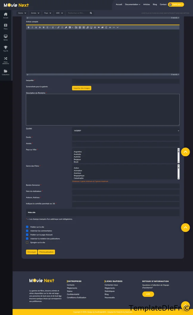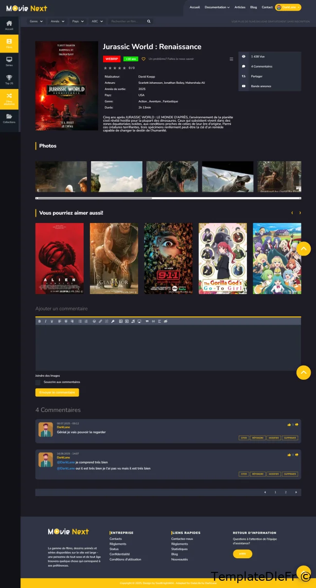 Instructions pour l'installation :1. Telecharger le modele2. Envoyer le dossier templates à la racine de votre site3. Installez le plugin supplementaire "Gallery Preview (LightGallery).xml" depuis le dossier Plugins.4. Dans les "Parametres du systeme", specifiez le modele de site "Movie-Next"5. Effectuez toutes les editions et modifications (si necessaire) comme d'habitude, dans la section "Gestions des modeles" -> "Modele du site".6. Pour utiliser le fichier 404.html, mettez le à la racine du site puis allez dans l'administrationadmin.php?mod=options&action=syscon dans configuration générale et plus bas trouvez "Utilisez une page distincte pour l'erreur 404" et activez lePS: si vous n'etes pas habitué avec la partie "5", vous pouvez utiliser NotePad++ pour modifier le modele.Les champs supplémentaires1. Les champs supplèmentaires sont fournis pour les sites qui n'en n'ont jamais utilisé.1.1. Ouvrez le dossier "champs-supplementaires" et envoyer le fichier "xfields.json" dans le dossier "engine/data"2. Pour ceux qui utilisent déjà des champs supplémentaires ouvrez les fichiers, et modifiez le nom des champs par les votres- fullstory.tpl- shortstory.tpl- _item\trending_movie.tpl- _item\slide_carousel.tpl- _item\movie_slider.tpl- _item\random-movies.tpl- _item\top-movies.tpl