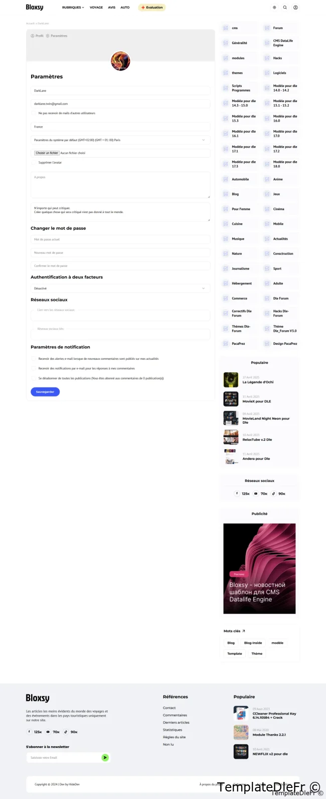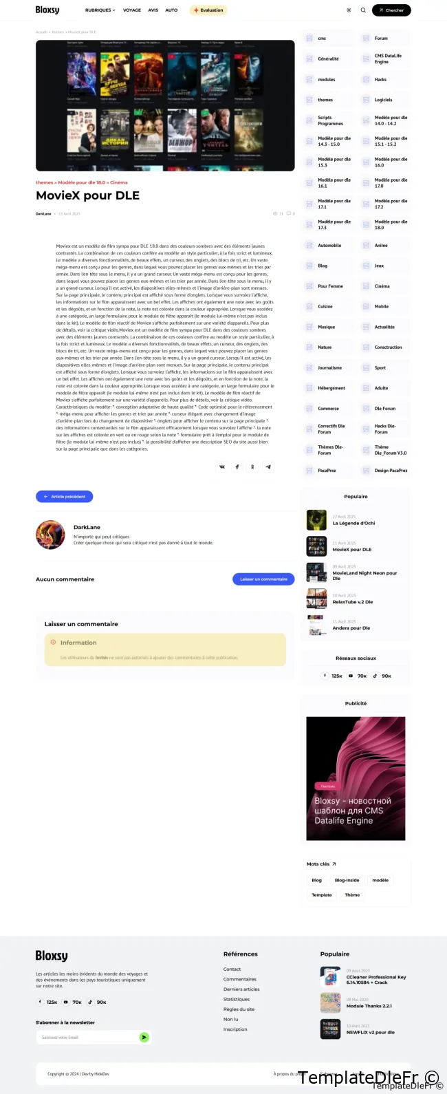 Le modèle moderne et minimaliste de Bloxsy est créé sous la version actuelle de DLE 18.1 et 19.0 est destiné à devenir un produit de masse pour les blogs et les sites d'information. Le modèle est écrit à l'aide des plugins JS actuels, html et scss. Un code commode et lisible apportera des modifications faciles, et un ensemble de mélanges et de composants individuels ajustera le projet à n'importe quelle tâche.