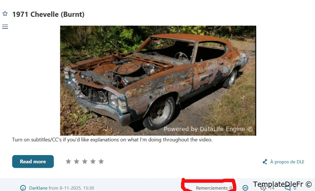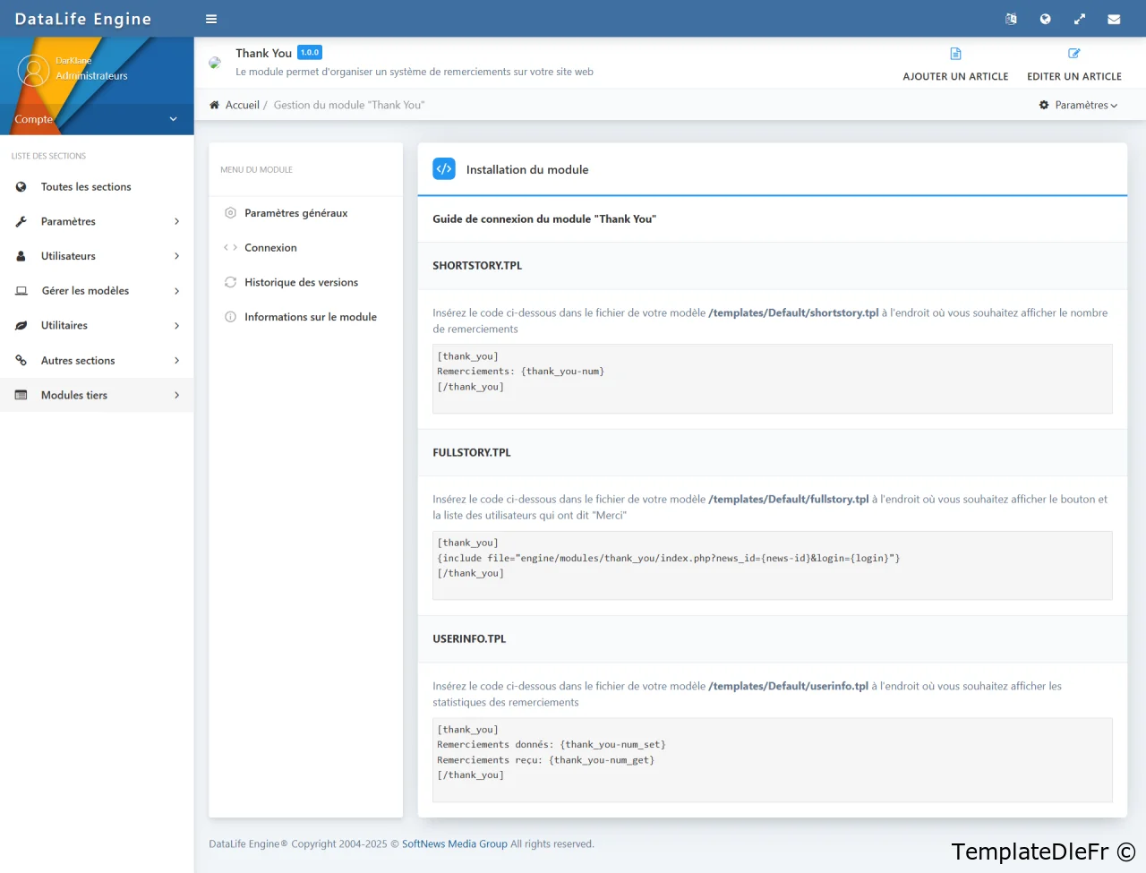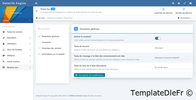 Module "Thank_You" pour DLE 14.x, 15.x, 16.x, 17.x, 18.x, 19.x, qui vous permet d'organiser un système de remerciements sur votre site. Vous pourrez désactiver le module globalement, spécifier le bouton texte, le titre de la liste des utilisateurs remerciants, qui sera affiché pour les utilisateurs.