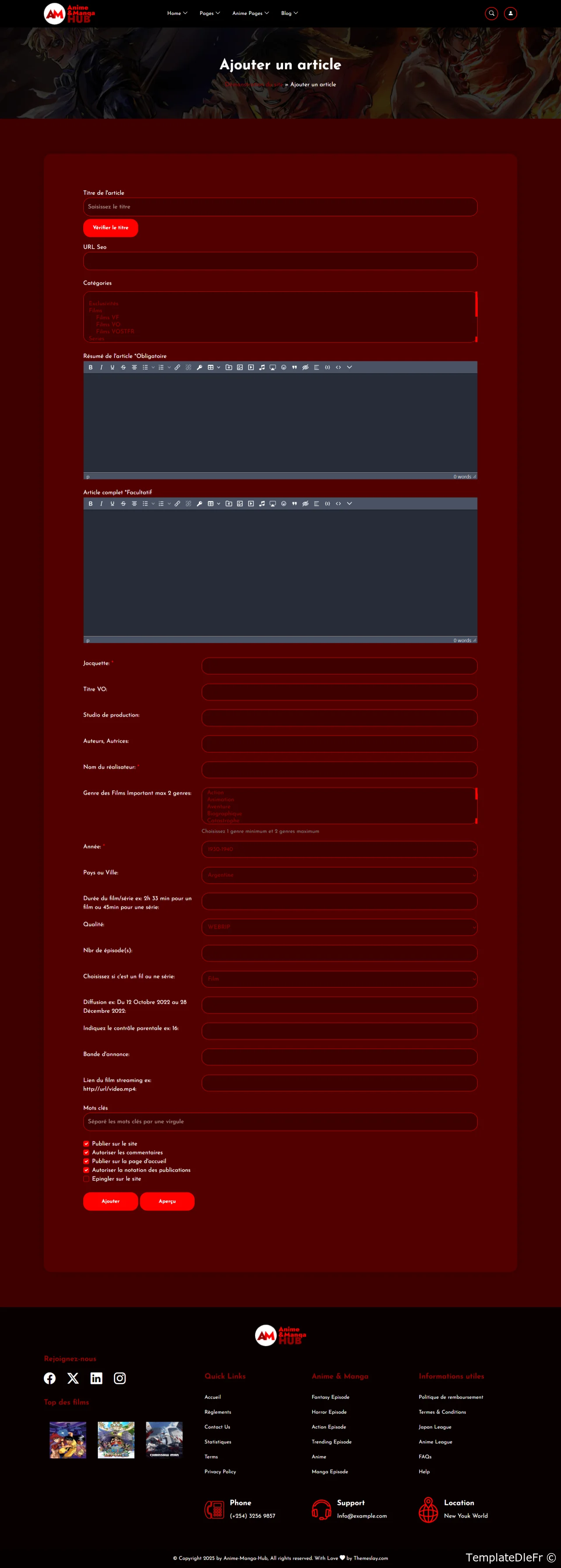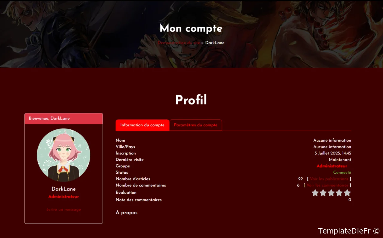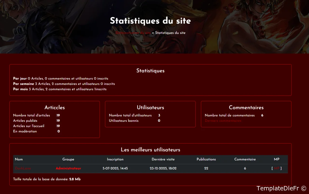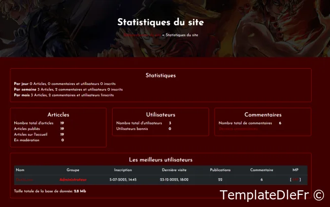 En ces fêtes de fin d'année, je vous présente un très beau template de couleur sombre dédié aux mangas et anime japonais (ou films) très bien conçu! Ce template est basé sur un template HTML5 CSS3 de Themeslay.com que j'ai adapté pour DLE 19.0, ce template inclus le modules NewsLetter v2.0.2. Chaque page sont agréable à regarder.