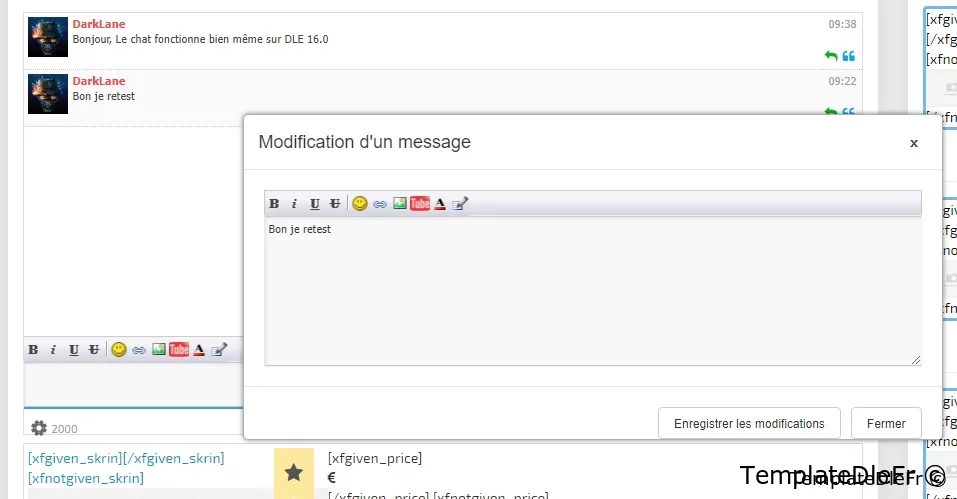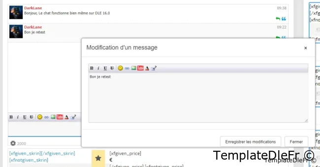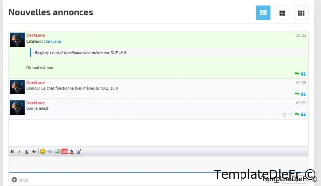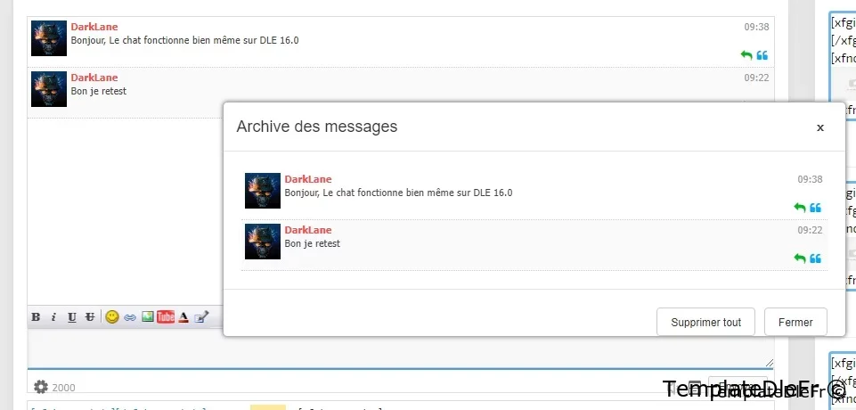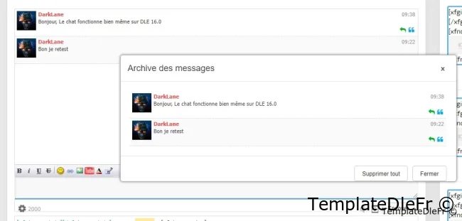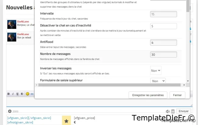 Les paramêtres non pas changé:Clé d'activation - La clé a été retirer pour que le chat sois libre.Groupes d'éditeurs - liste des ID de groupe d'utilisateurs. Qui peut modifier et supprimer des messages, ainsi que qui peut interdire d'autres utilisateurs, l'administrateur ne peut pas être banni :).Rafraichissement - la fréquence d'actualisation de la fenêtre de discussion. Il n'est pas conseillé de définir un très petit écart. 15 secondes ou plus est optimal.Désactiver le chat en cas d'inactivité - après combien de minutes d'inactivité le chat passera en mode veille.Anti-flood - afin de ne pas inonder ajouté le paramètre de temps d'attente entre les messages ajoutésNombre de messages - le nombre de messages affichés dans la fenêtre de chat.La longueur minimale du message et la longueur maximale du message - j'espère qu'elles n'ont pas besoin d'une description supplémentaire.Désactiver l'indexation du chat - Si cette option est activée, aucun message ne sera affiché dans le code source de la page, le chat fonctionnera entièrement sur AJAX.Activer la mise en cache - Je recommande fortement d'utiliser la mise en cache. Chez moi, je peux me permettre de l'éteindre car l'affluence est nulle.Afficher l'avatar - Lorsque cette option est activée, la demande devient légèrement plus lourde et l'avatar de l'auteur s'affiche dans le chat lui-même.Filtres les mots - active le filtre de mots. Dans ce cas, la base de données standard de mots dans DLE et la vôtre dans le chat sont utilisées.Filtre de mots de la liste personnelle - fonctionne lorsque le filtre de mots est activé.Accès invité - permet aux invités d'écrire des messages dans le chatNom de l'invité - le nom de l'invité , s'il est autorisé à laisser des messages dans le chat comme dernier chiffre de son adresse IP.Archive - permet de générer une archive. Lorsque l'archive est désactivée, il n'y a pas de bouton dans le panneau.Accès de groupe à l'archive - une liste d'ID de groupe d'utilisateurs pouvant afficher l'archive de messages.Nombre de messages dans l'archive - le nombre de messages affichés sur une page de l'archive.BB-code - comprend le panneau des balises et inclut le traitement de ces mêmes balises.Autoriser les liens - vous permet d'utiliser des balises de sangsue et intercepte également les liens directs dans le texte du message. Si vous désactivez l'utilisation des liens, le bouton du panneau ne s'affiche pas.Autoriser les images et Autoriser le changement de couleur - similaire à sangsue.Eh bien, ci-dessous, en fait, trois listes de trois groupes d'émoticônes.Information: L'erreur corrigé est en faite une fonction qui existe plus dans DLE 19.0Cette version est une légère restructuration des fichiers et une adaptation à la versions modernes de DLE 19.0.Les instructions d'installation et de mise à jour se trouvent dans l'archive.